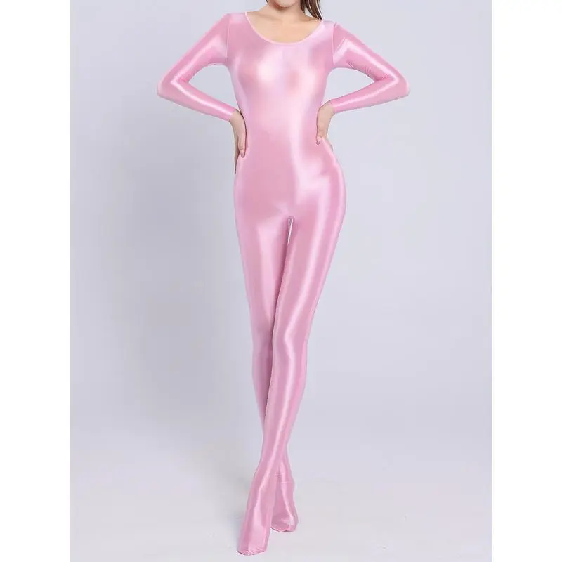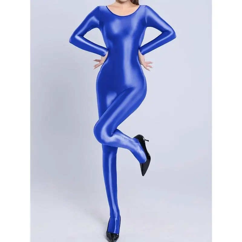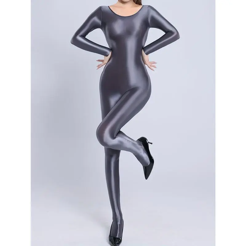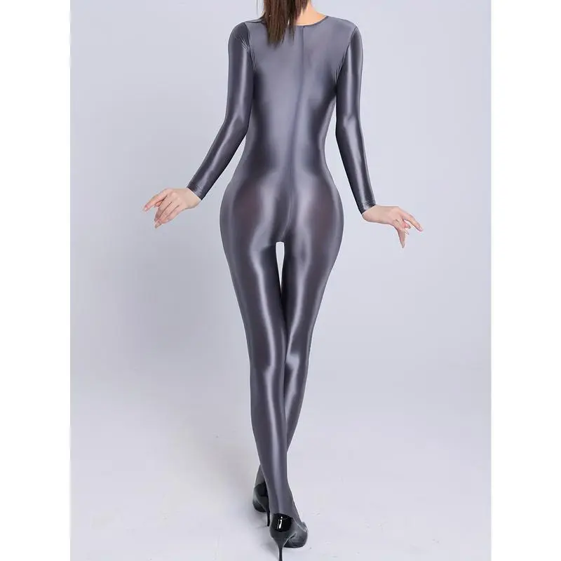 WomenShinySatinGlossyBodystockingLongSleeveBodysuitStretchFootedRomperJumpsuitCatsuit