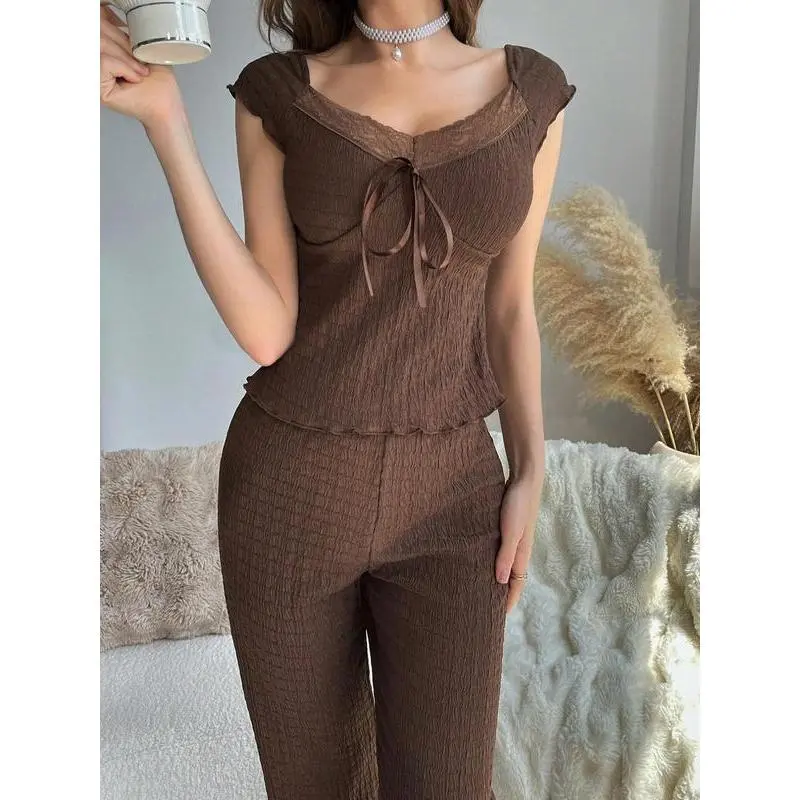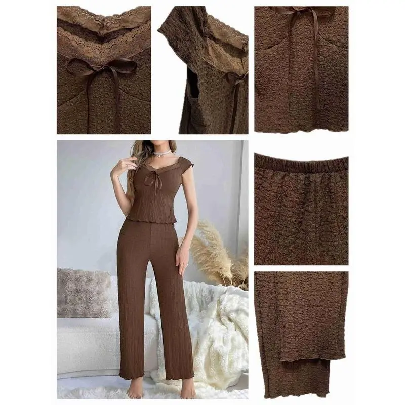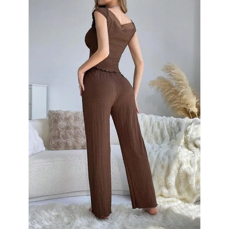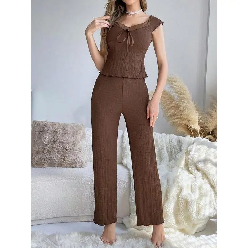 Two-piece Set Women's Solid Textured Contrast Lace Tie Front Cap Sleeve Top & Elastic Waist Pants Loungewear Set, Elegant Sweetheart Neck Lettuce Trim Top & Trousers Pj Set, Ladies Sleepwear for Spring & Fall