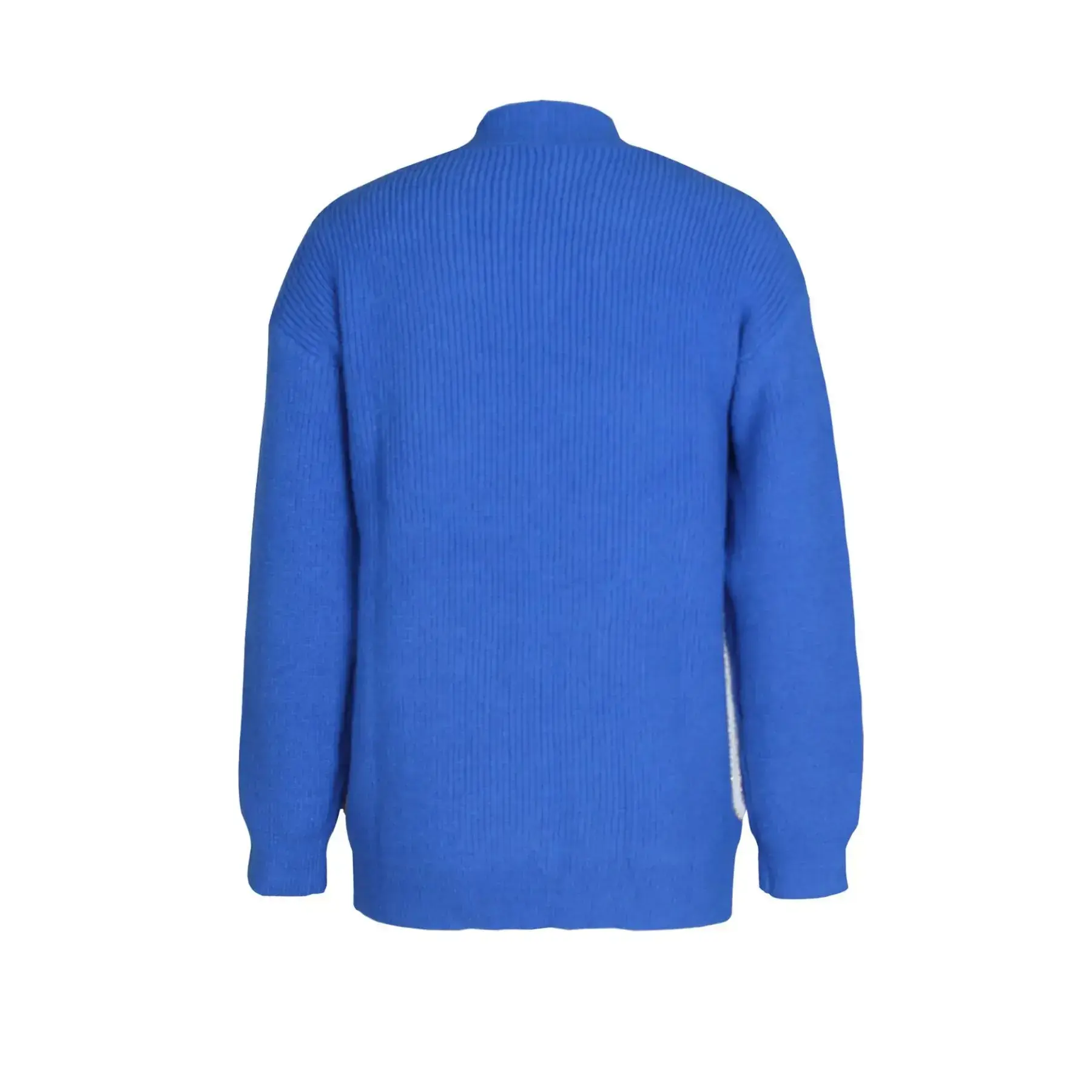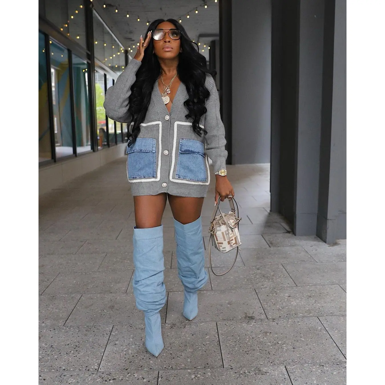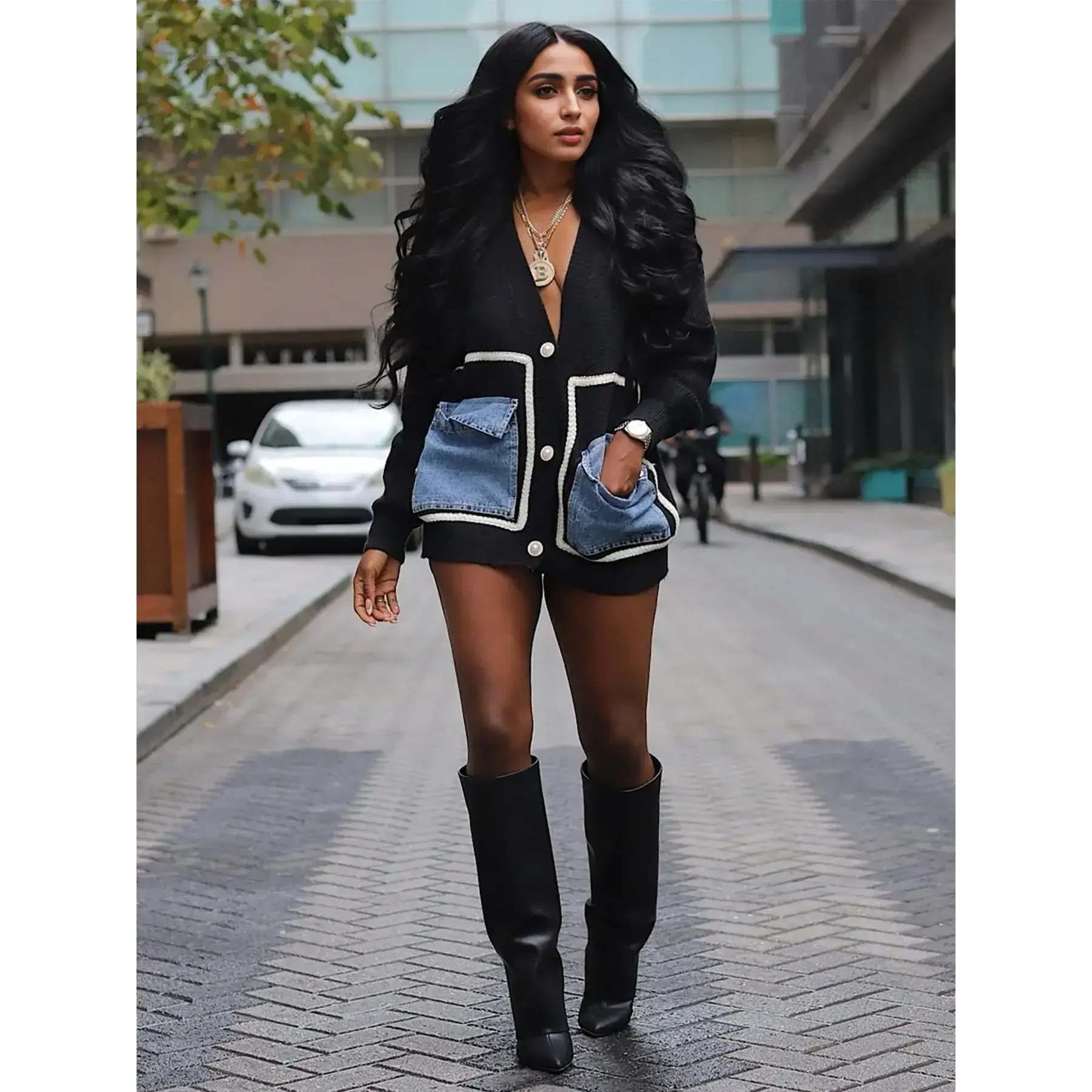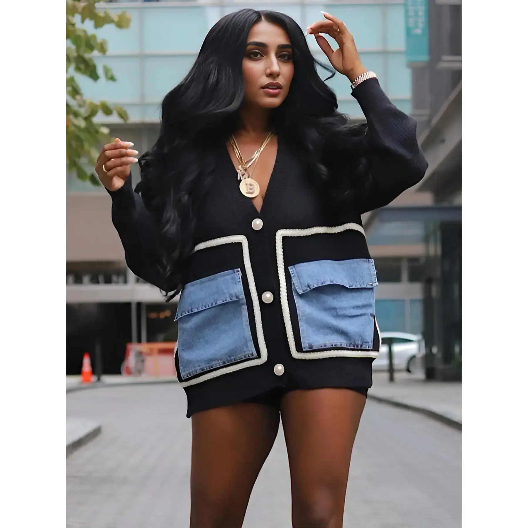 Women's Patchwork Button Front Sweater Cardigan, Casual Deep V Neck Long Sleeve Pocket Cardigan, Ladies Spring & Fall Knitwear