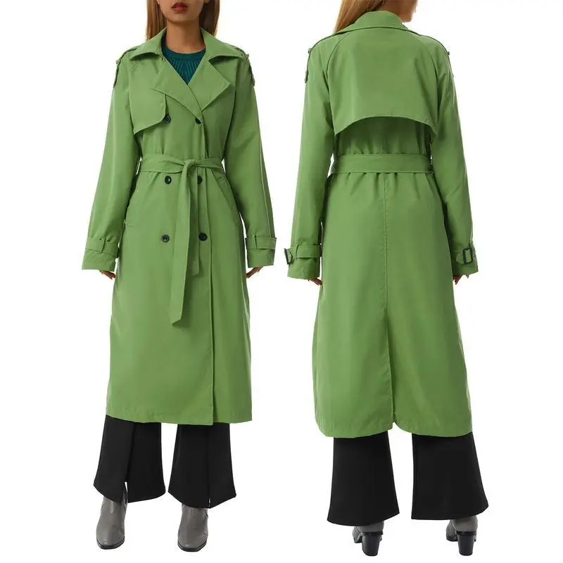 New Women′s Fashion Double Breasted Long Trench Coat, Classic Lapel Long Sleeve Windproof Overcoat with Belt Fall,Army Green, Khaki, Black, Blue S, M, L, XL, XXL