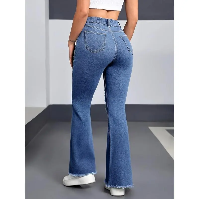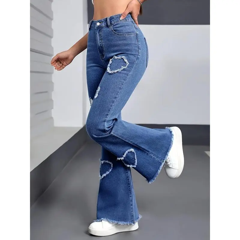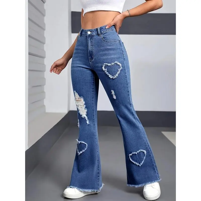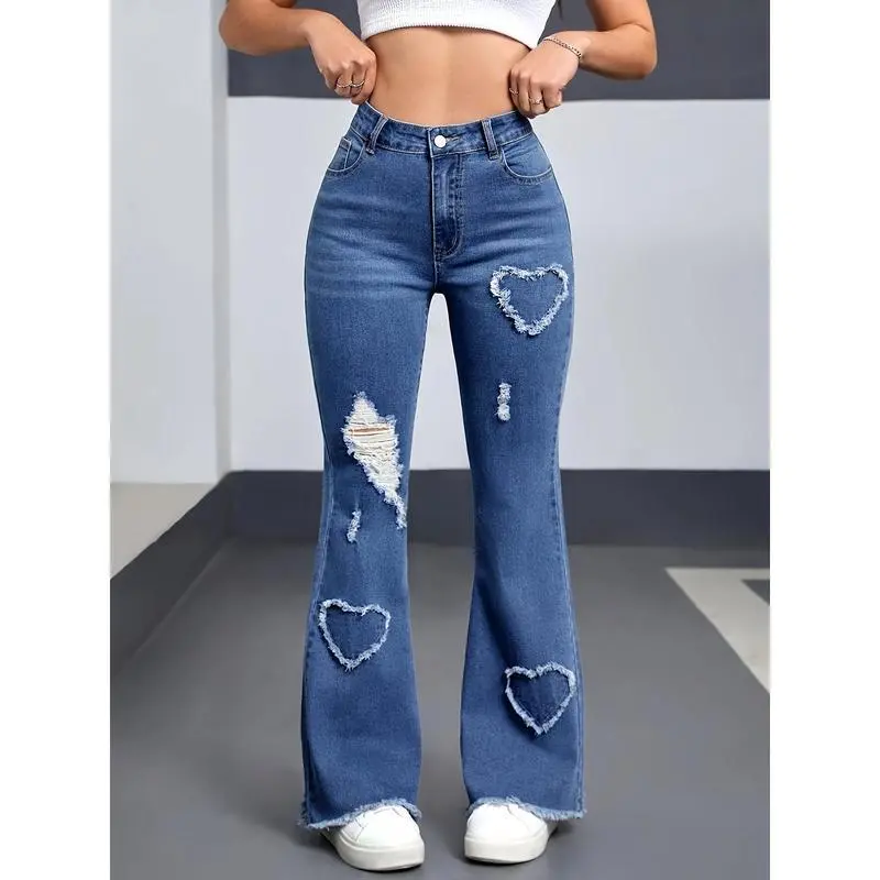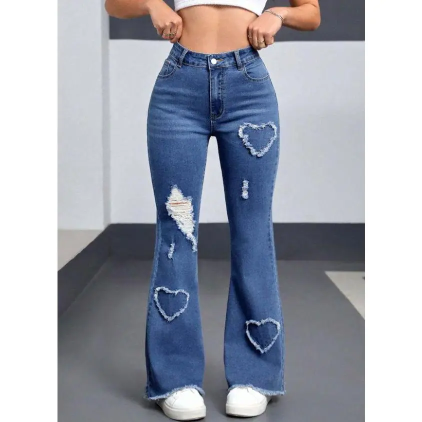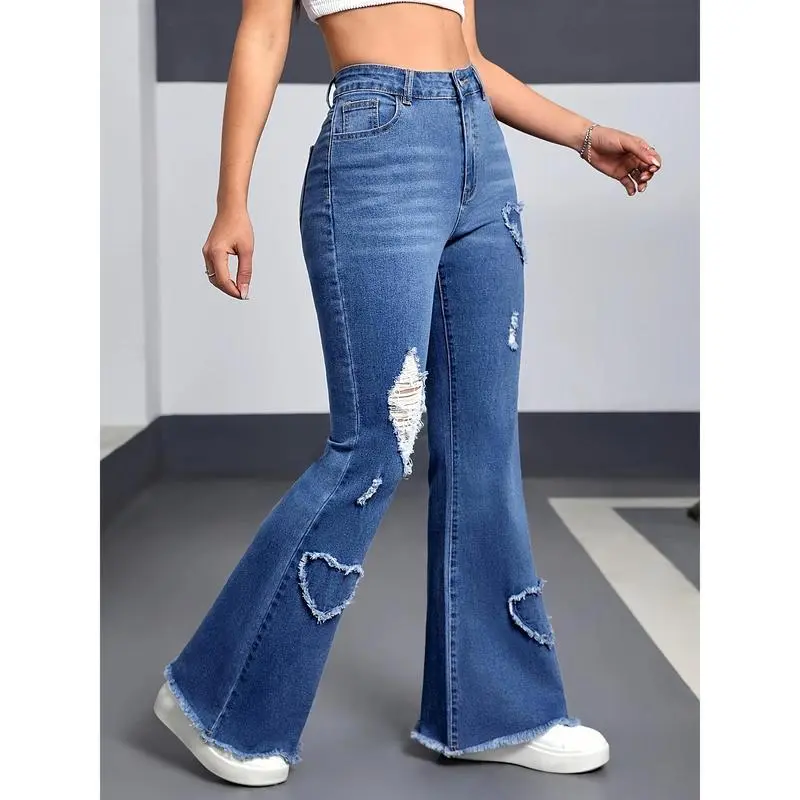 Women'SCasualHigh-WaistedFlareJeanswithHeart&TearDetail-StretchyDenim,ZipperFly,MidWaist,