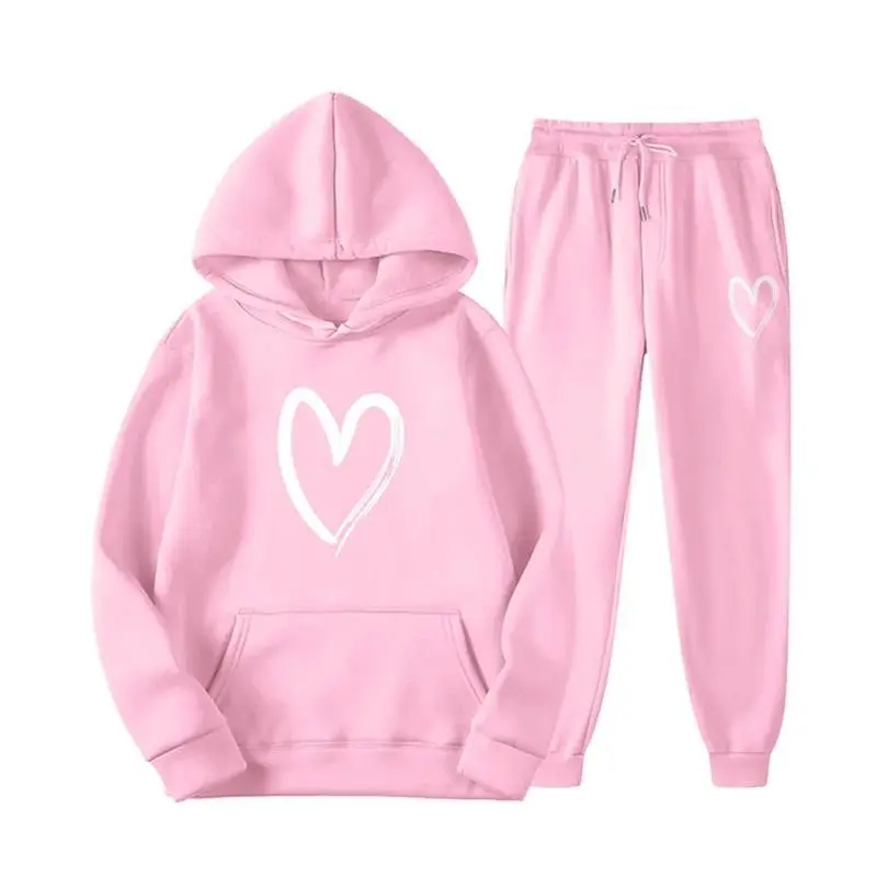 Women Heart Print Hoodies 2 Piece Set Autumn Oversize Sport Casual Hooded Sweatshirts+Trousers Suit y2k Pullover And Sweatpants