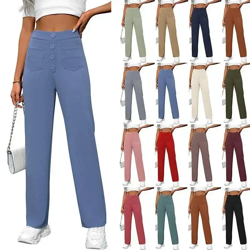 New European and American Spring and Autumn Women's Trousers High Waist Pocket Wide-leg Button Casual Loose Straight Pants