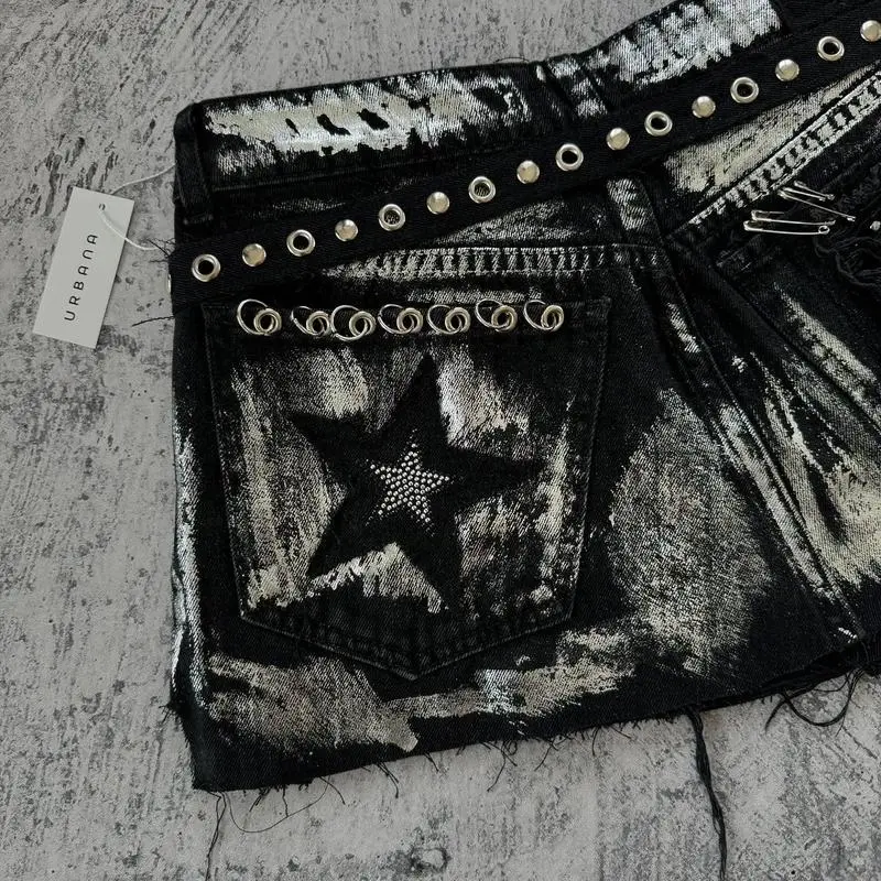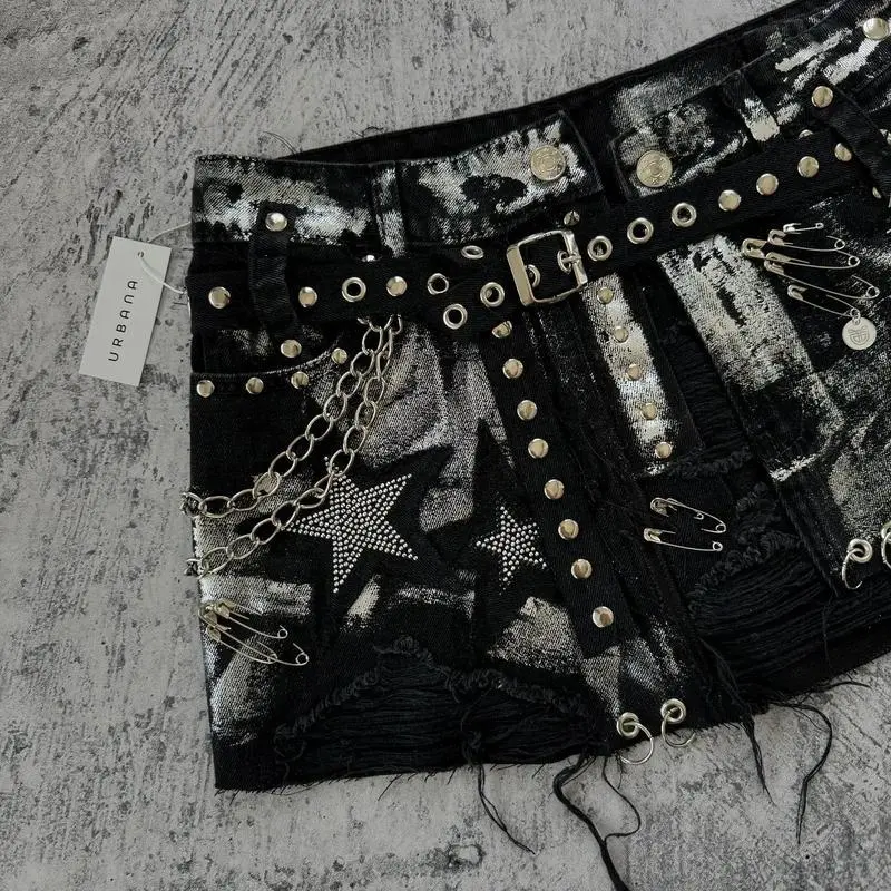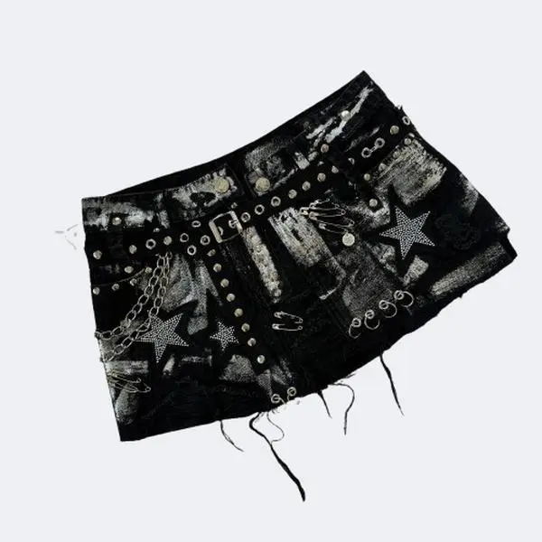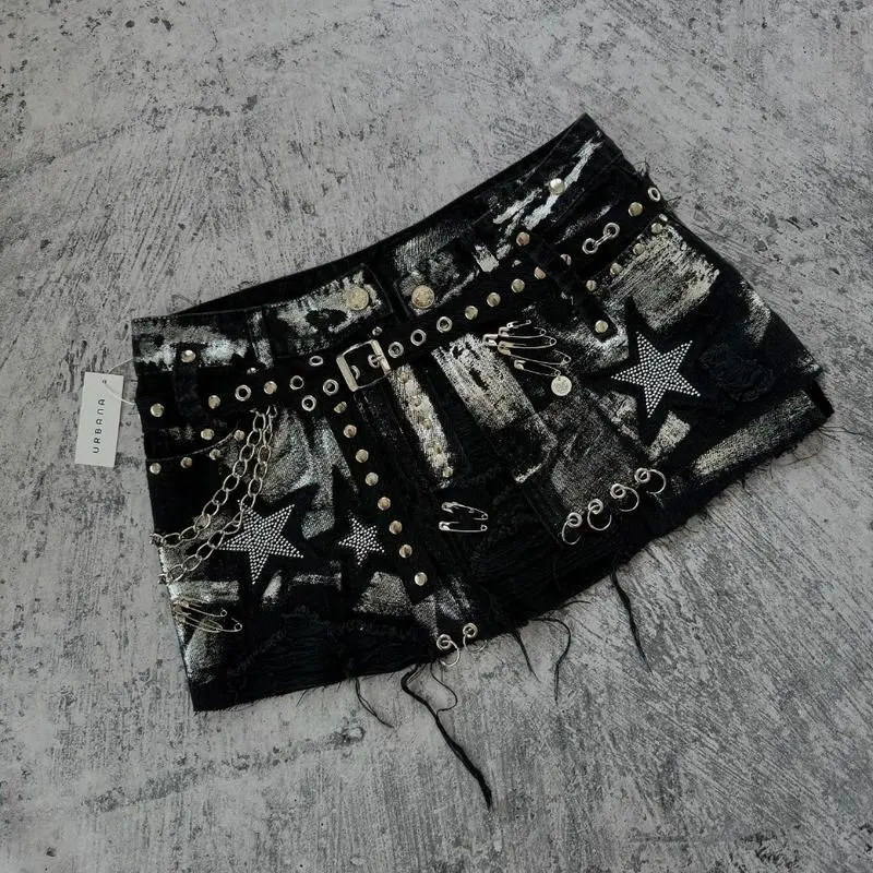 Y2KNewGothicRetroBlackDenimSkirtHarajukuStarGraphicRhinestoneRivetMiniSkirtSexyHotGirlSlimLowWaistHipSkirts