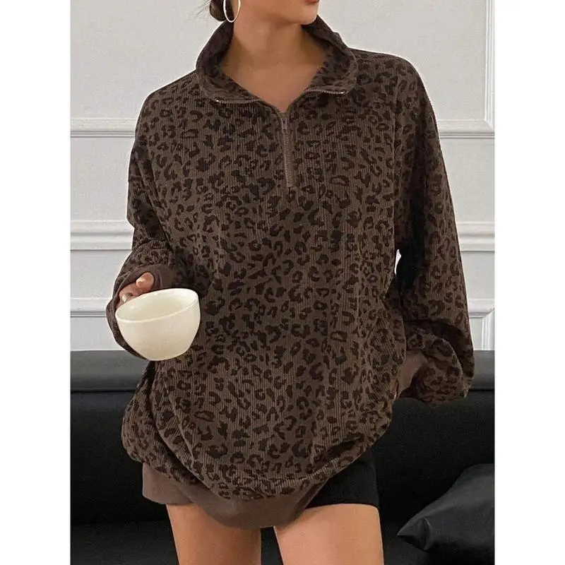 WomenCasualZipUpFrontLongSleeveLeopardPrintSweatshirtFabricFit