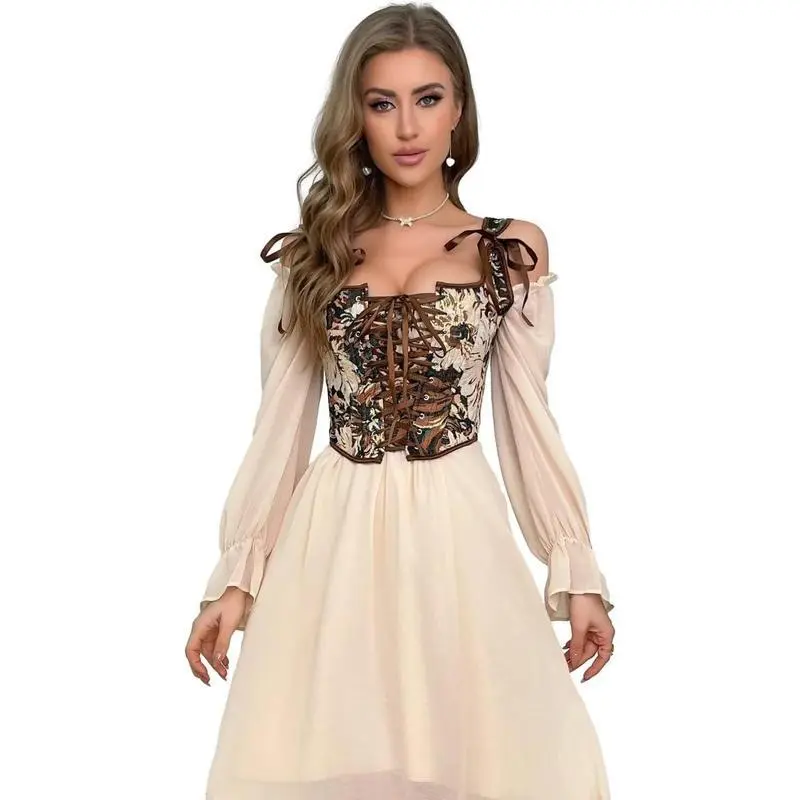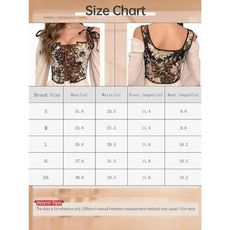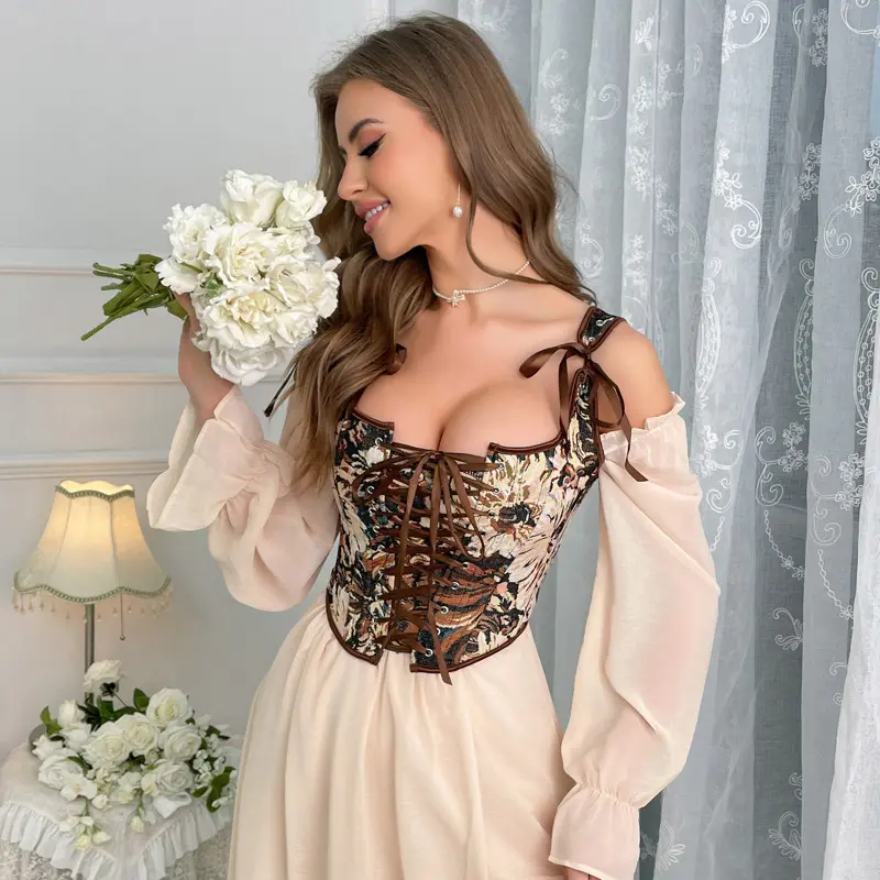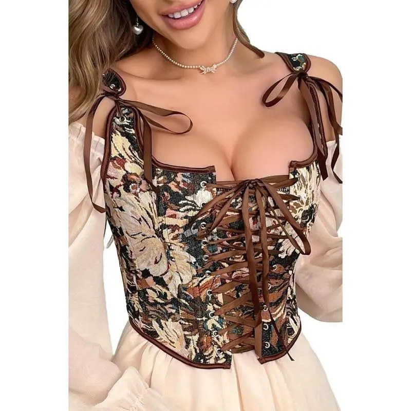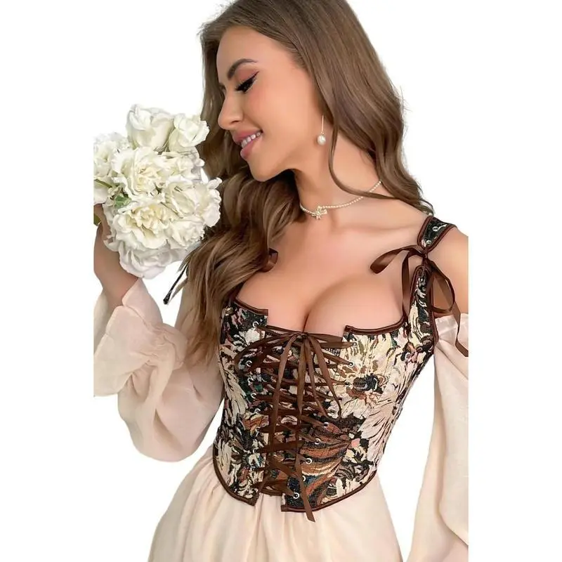 VintageRenaissanceCorsetTopforWomenFloralBustierLaceUpBonedOverbustLingerieBodyshaper