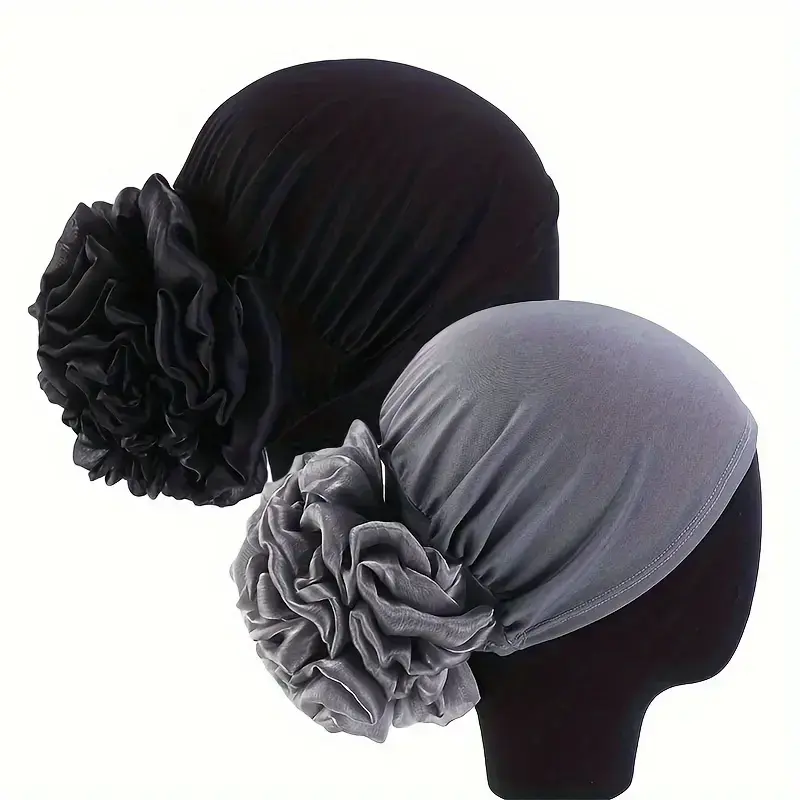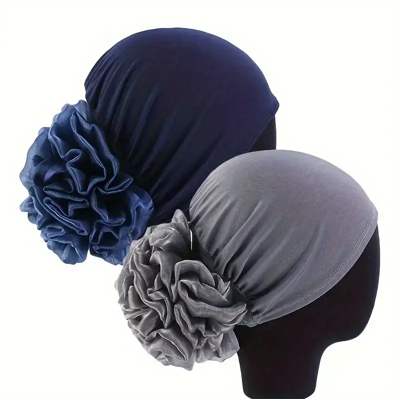 2 Pcs/Set Elegant Boho Flower Turban Hats - Women's Head Wraps, Elastic Beanies for Daily Use, Ramadan, Chemo Cap, Soft, Comfortable, Stylish Accessories-