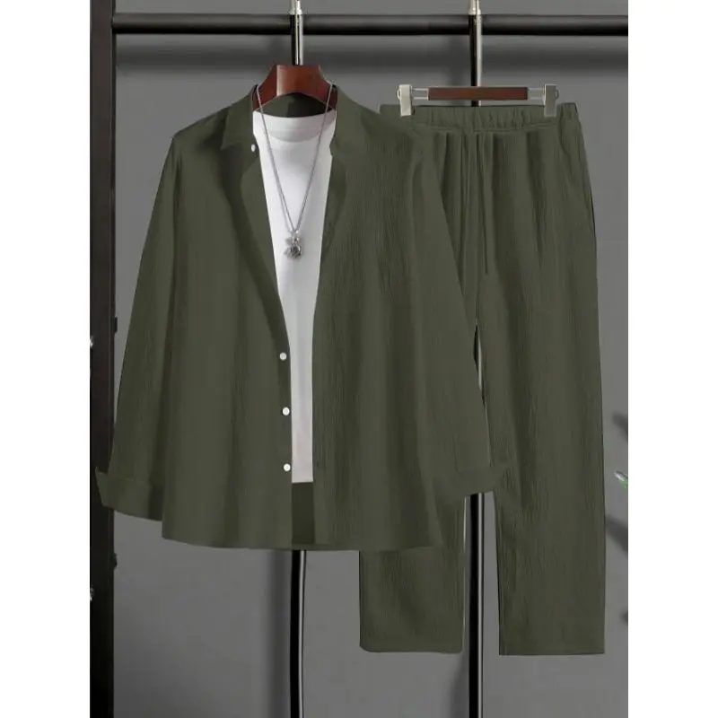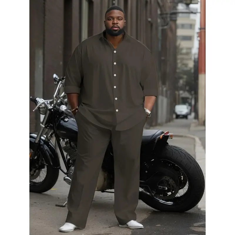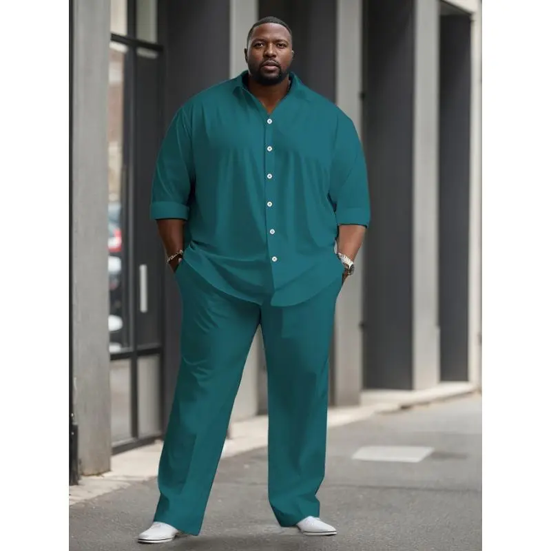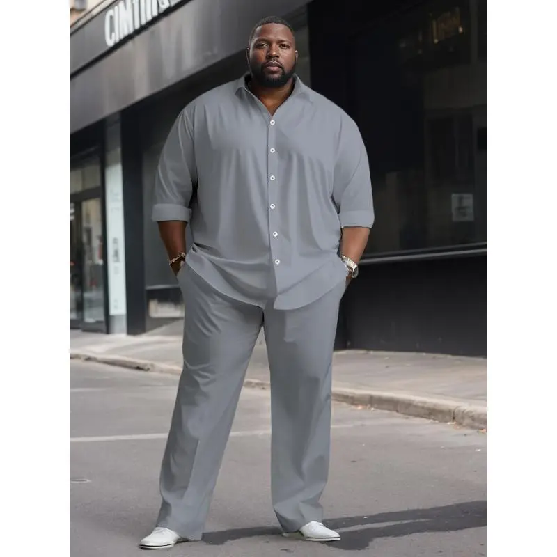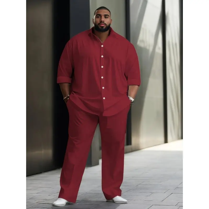 Men's Plus Size Casual Outfit Set - Solid Color, Long Sleeve Button-Up Shirt & Pants with Pockets, Stretch Fabric, Machine Washable, PLUS SIZE