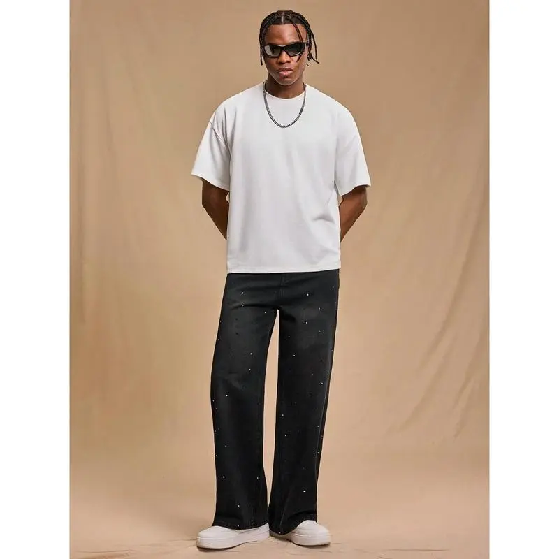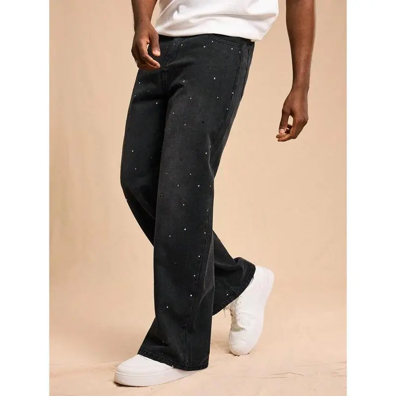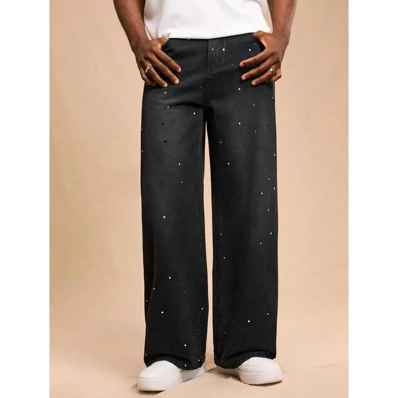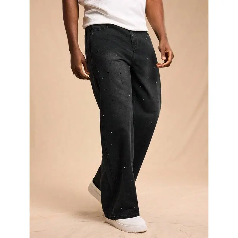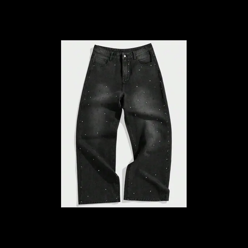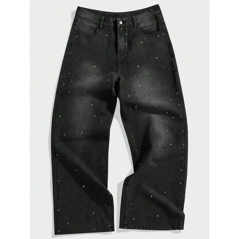 ?? Five-star review??Men's Loose Fitting Rhinestone Embellished Dark Grey Washed Jeans,Streetwear Men Party Clothes