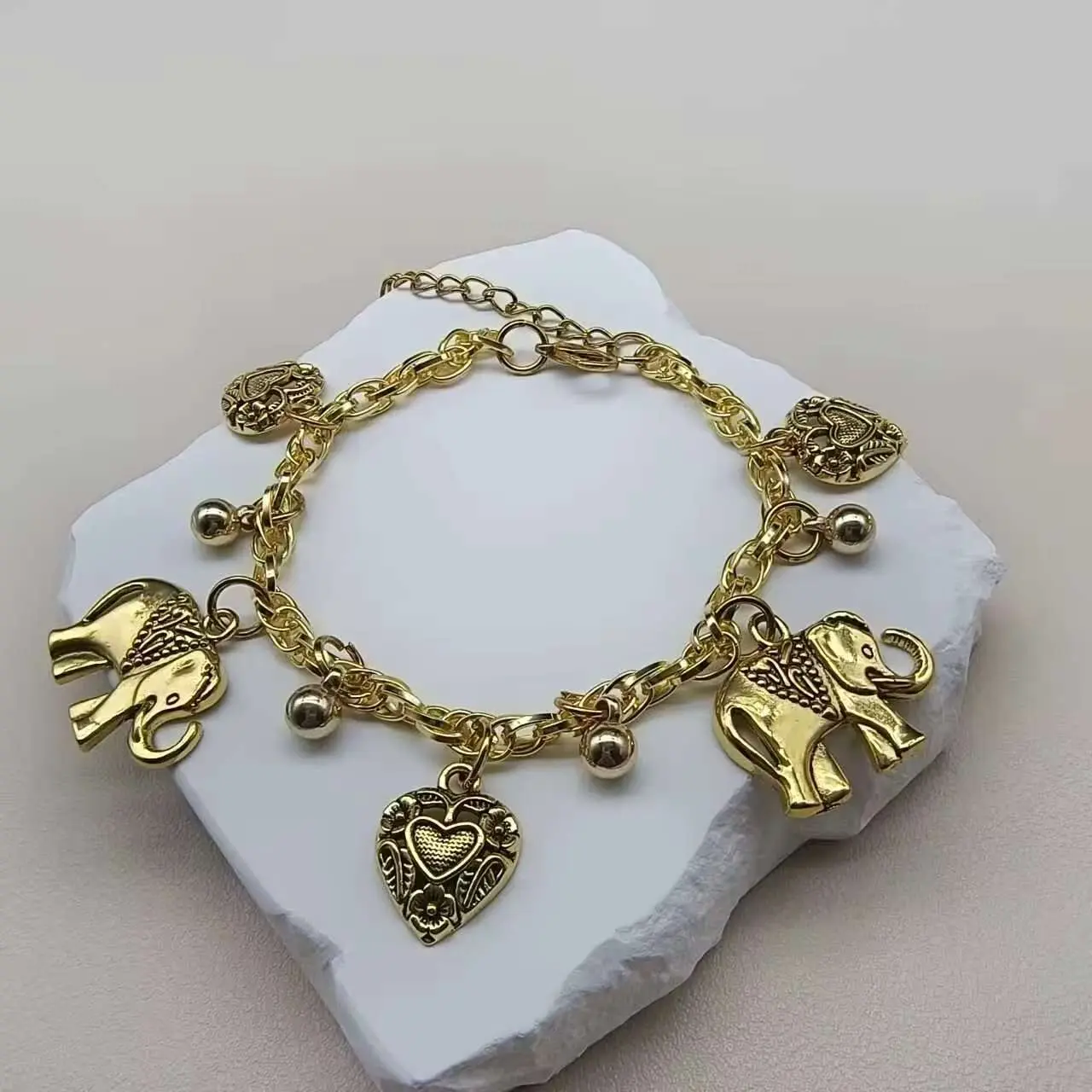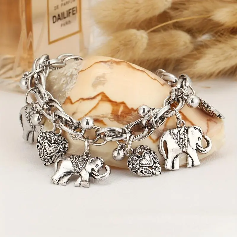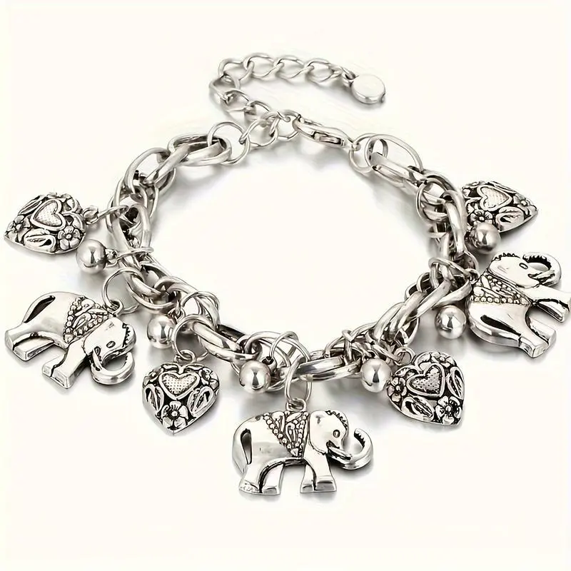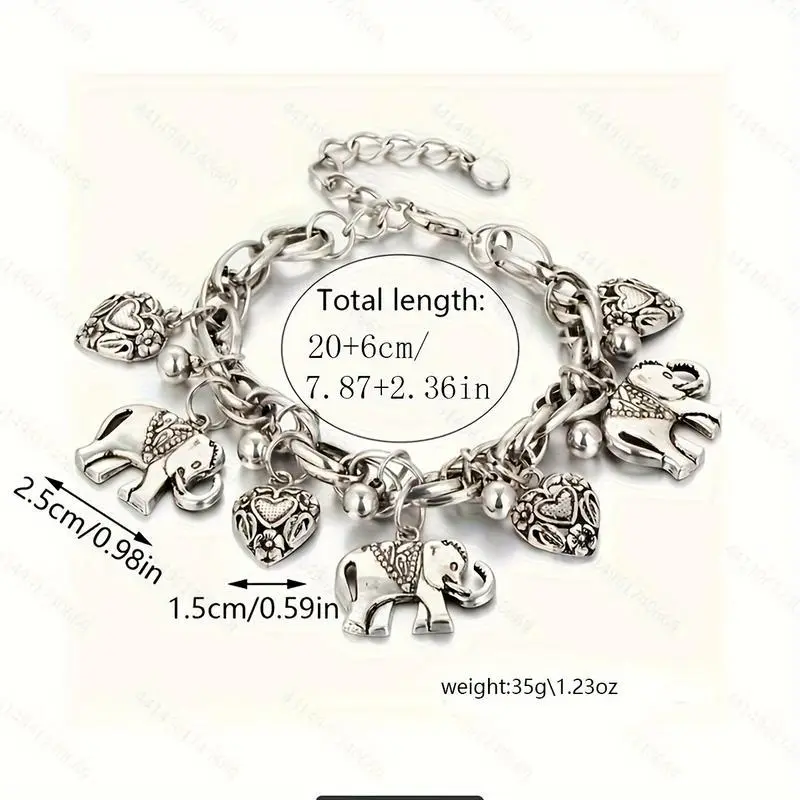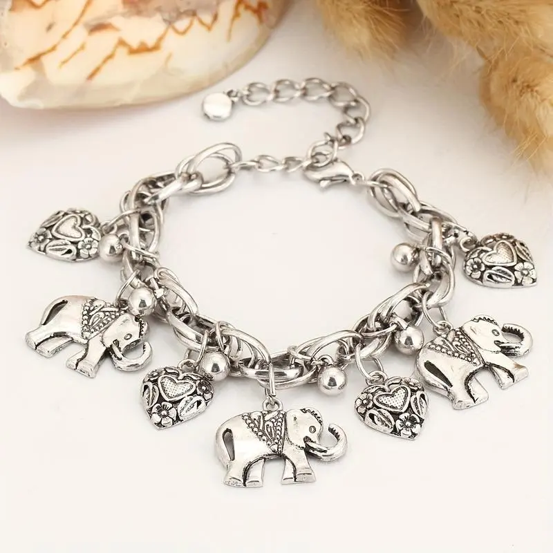 1Pc Fashion Vintage Carved Elephant Bracelet, Peach Heart Charm Bracelet Hand.