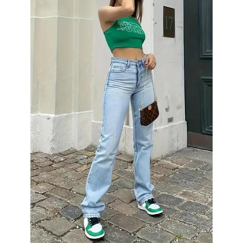 High-Waisted Light Washed Straight Jeans, Slash Pocket Casual Loose Fit Denim Pants for Women