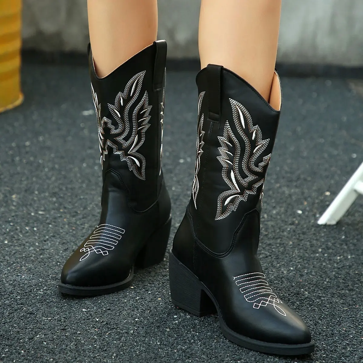 ��Distinct Embroidery��: Featuring a unique white embroidery on the upper, these boots stand out from traditional cowboy footwear. ��Robust Construction��: Crafted from high-quality PU leather, these boots ensure durability and long-lasting wear through the seasons. ��Mid-Calf Height��: Designed to rise above the ankle yet below the knee, these boots provide optimal coverage and protection. ��Solid Grip��: Equipped with a rubber sole, offering excellent traction and stability on various surfaces for confident strides. ��Chunky Heel��: The chunky heel design not only elevates your height but also adds a bold touch to your overall look.