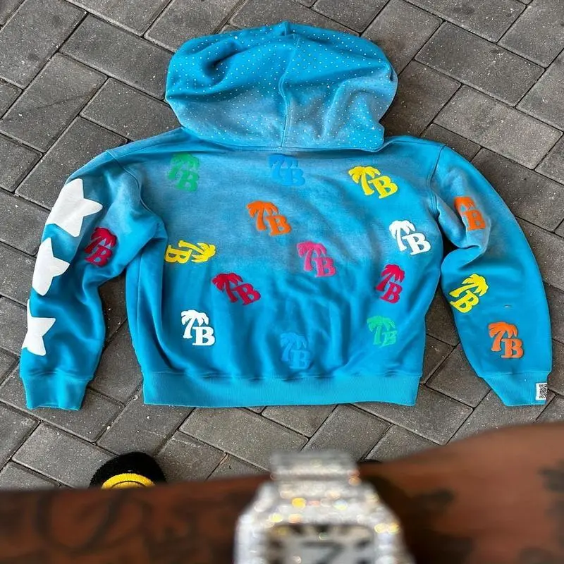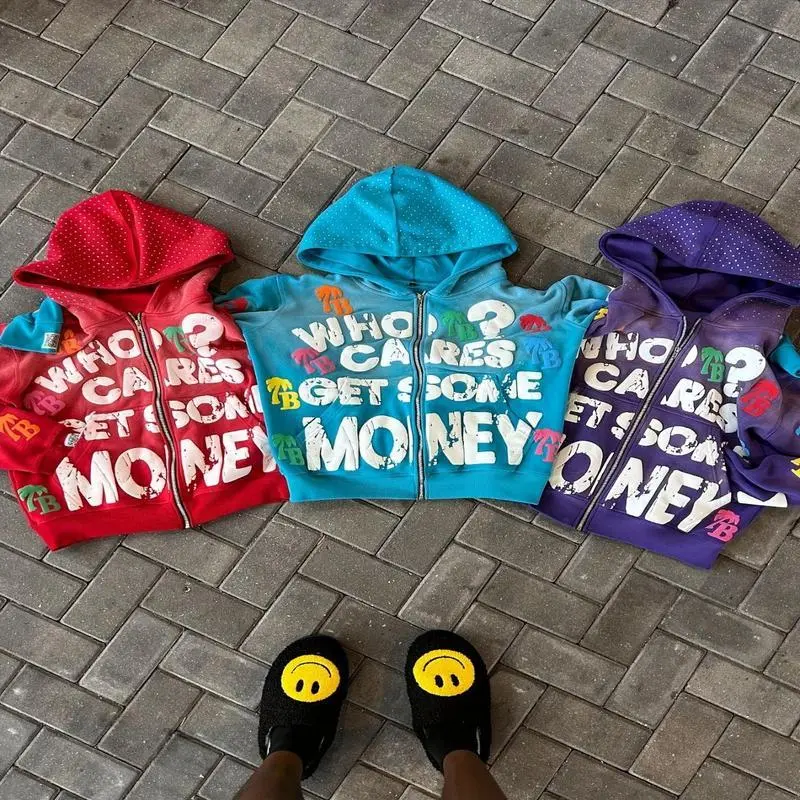 Unisexoversizedzipperhoodie-Whocaresaboutgettingsomemoney?PatternprintwithcolorfulTBletterpatchesY2Kstreetstylehip-hopsportswearmen'sandwomen'slongsleevedcasualjacketautumnandwinterfashionjacketstreetfash