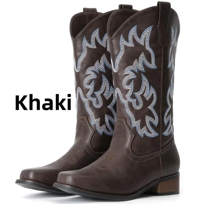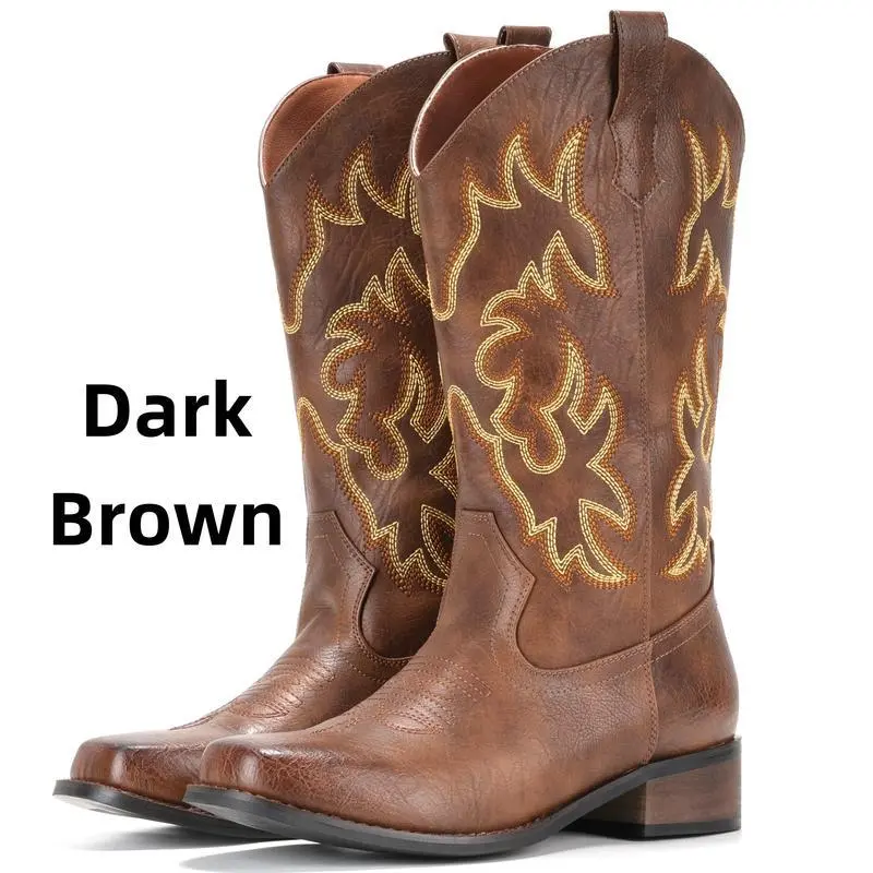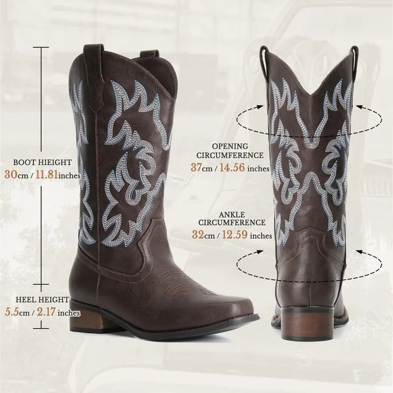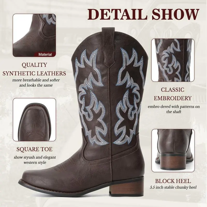 CowboyBootsForWomenSquareToeCowgirlBootsMidCalfWesternBootsPullOnFashionCowboyBoots