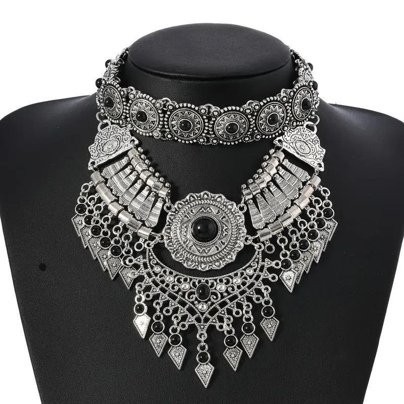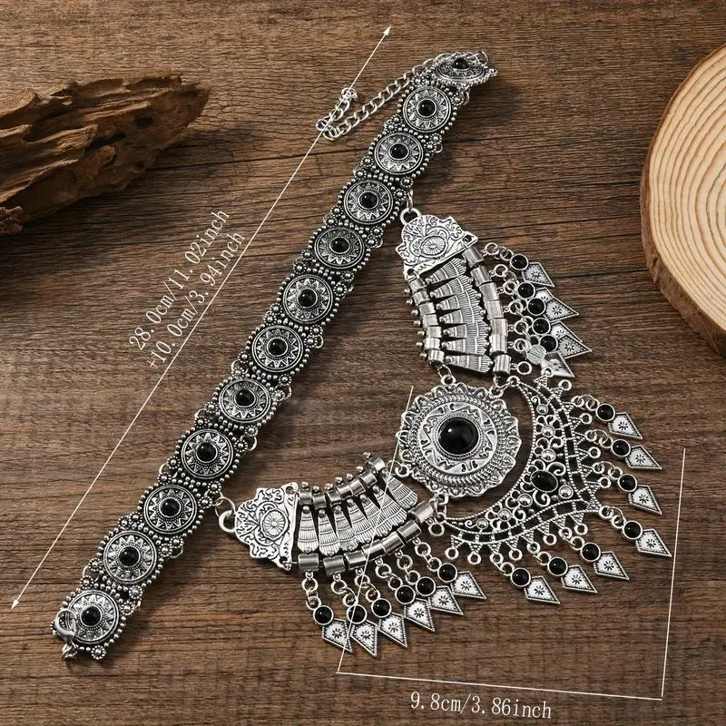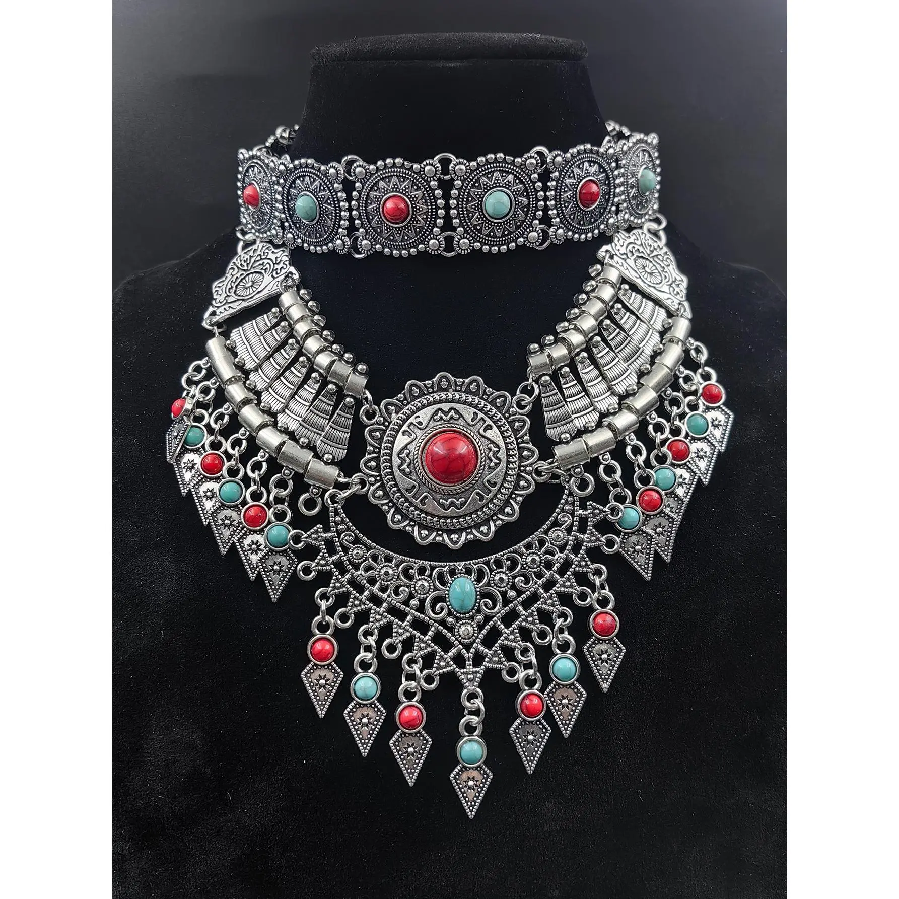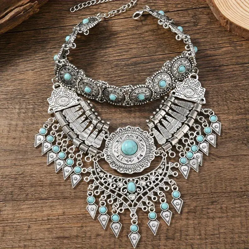 [Bohemian Choker] Bohemian Handmade Choker Necklace | Vintage Golden-Tone Zinc Alloy with Turquoise Beads & Teardrop Tassel Pendant, Layered Boho Jewelry for Daily Wear, Parties, Ramadan, Year-Round Accessories for Women
