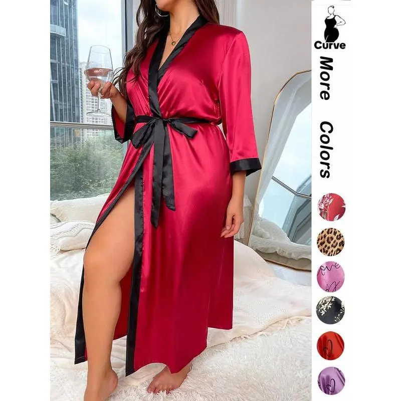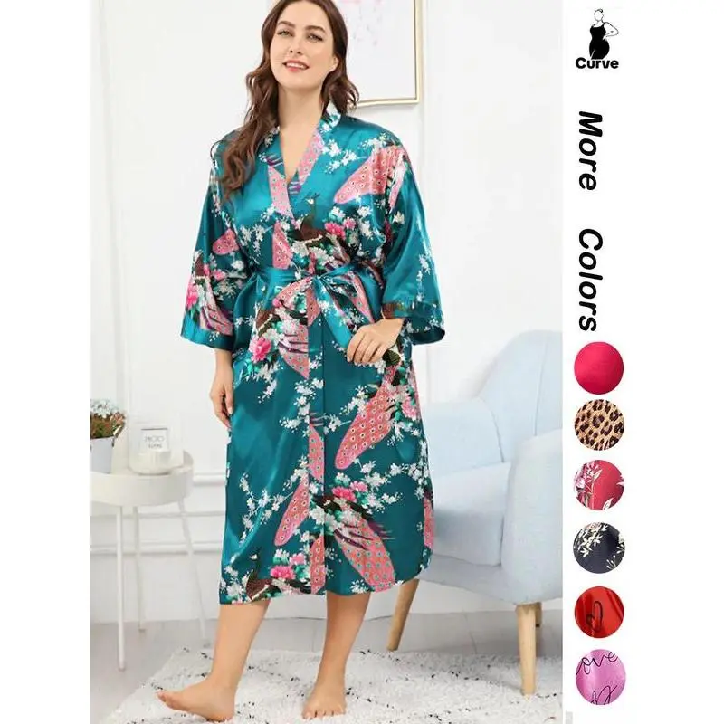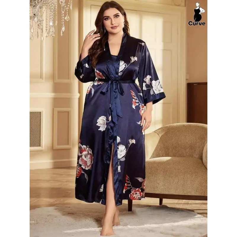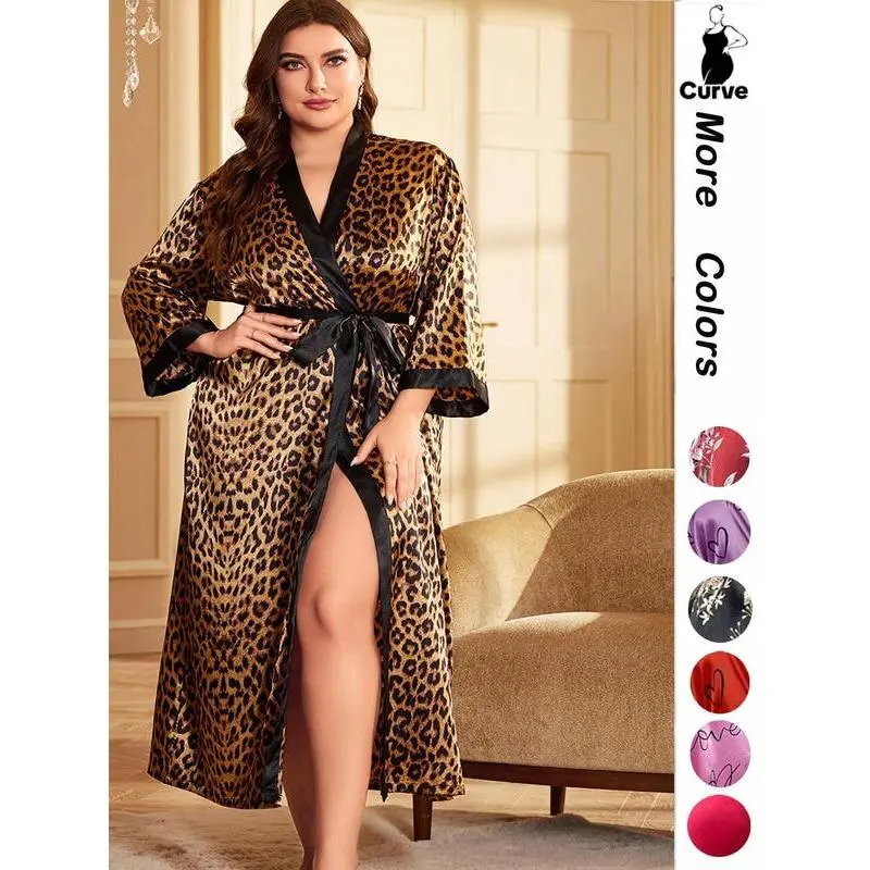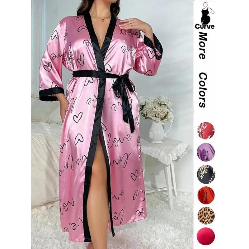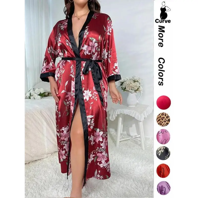 [Plus Size] Halloween Print Belted Wrap Long Sleeve Loose Loungewear Robe, Women Long Sleeves Nightwear, Fall Lady Long Lounge Robe Gowns, Halloween Pajamas, Robes for Women, Floral Print Robe, Wrapped Belted Robe, Casual Soft Bathrobe Womenswear Vneck
