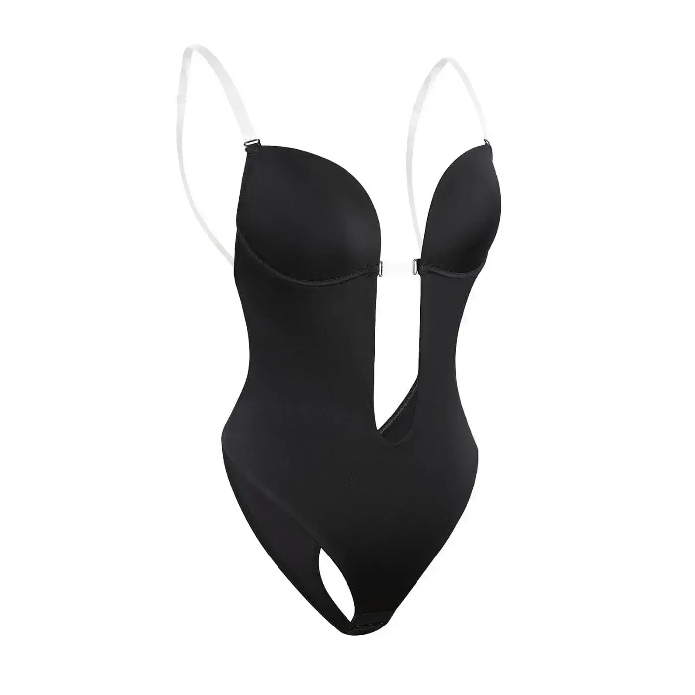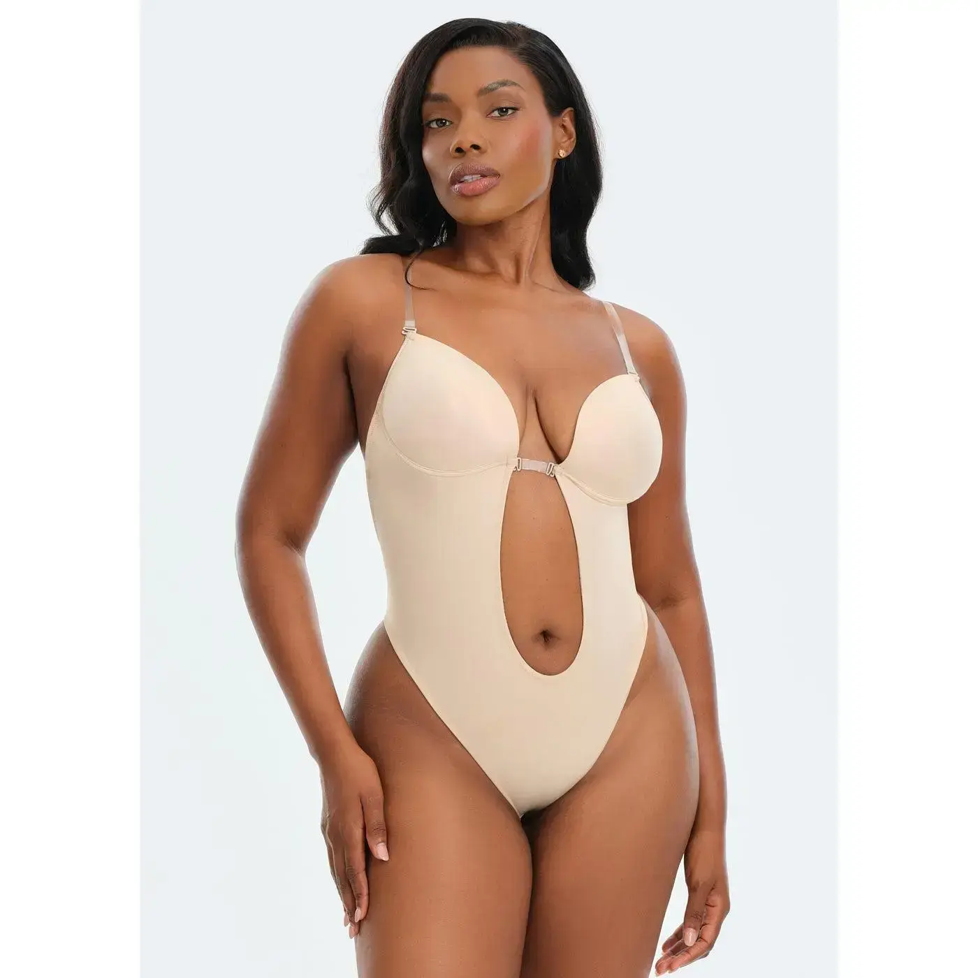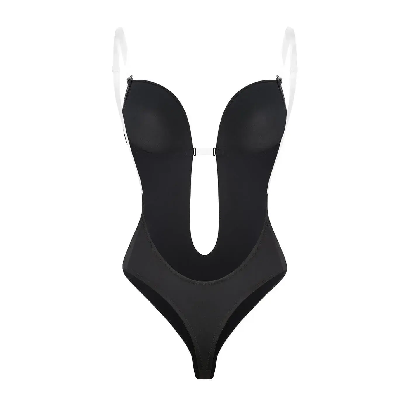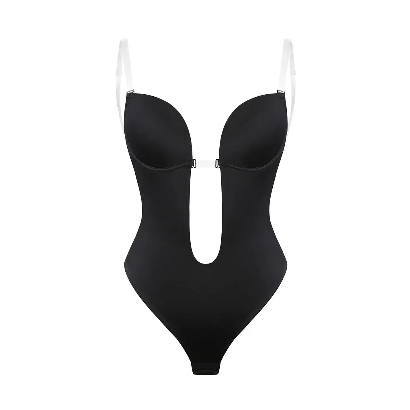 This is the ultimate bra and shapewear undergarment for backless and low cut plunge dresses. This is the hidden secret to make your bust and curves look amazing under those challenging outfits. It features adjustable clear plastic straps and a thong bottom.