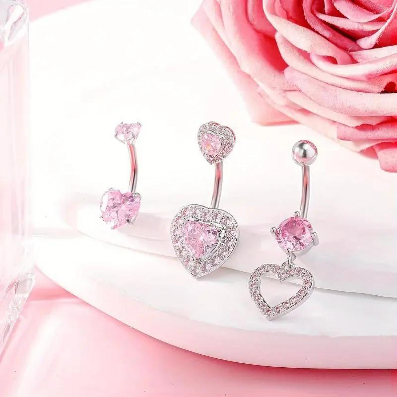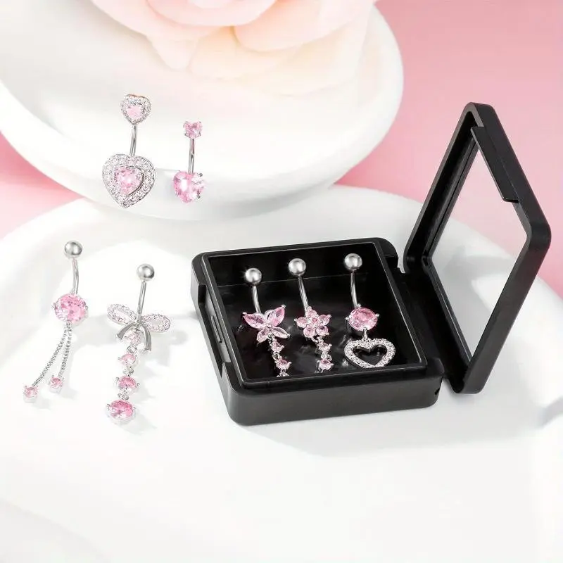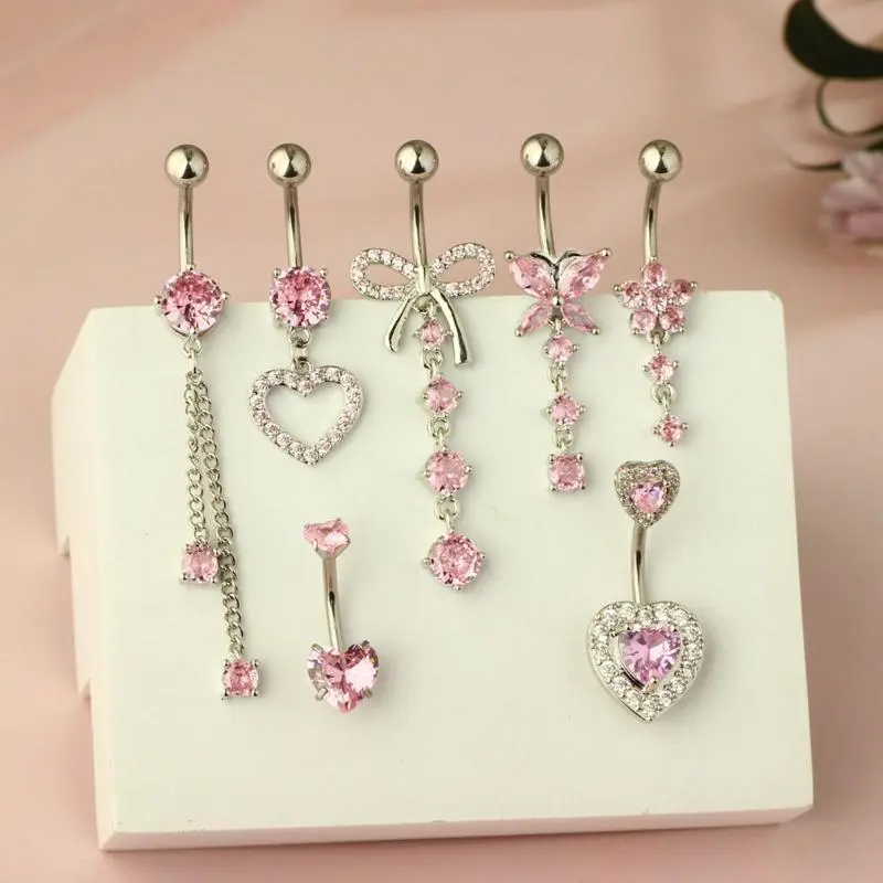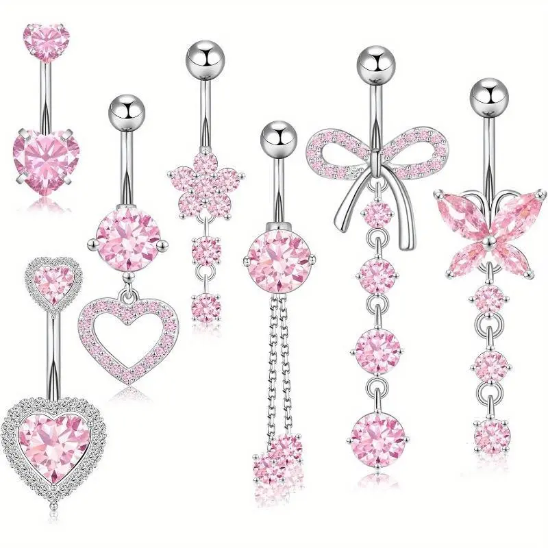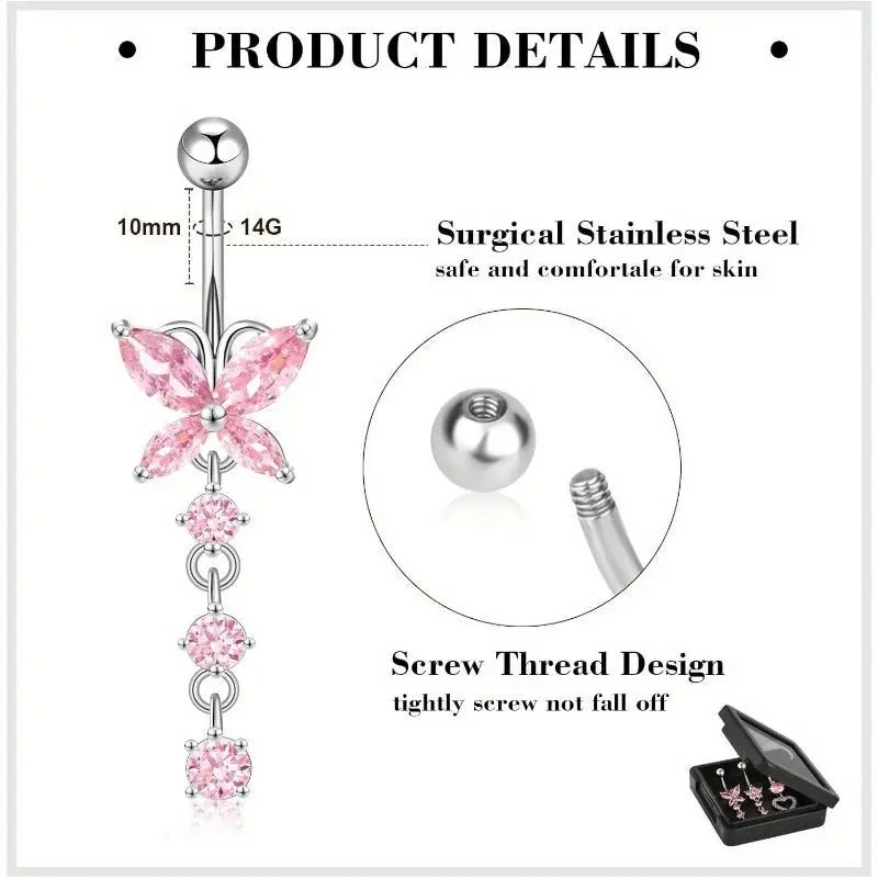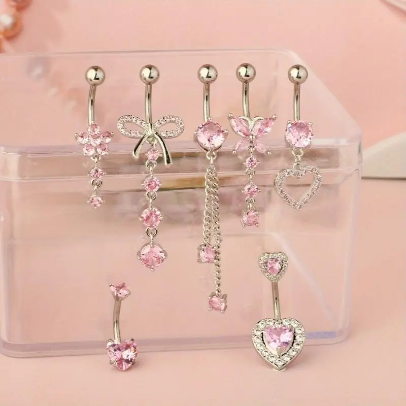 7Pcs Dangle Belly Button, Piercing Surgical Stainless Steel Belly Rings, 14G Belly Button Ring, Cute Heart Butterfly Flower Dangling Belly Piercing Jewelry For Women floating navel ring jewelry charm jewelry