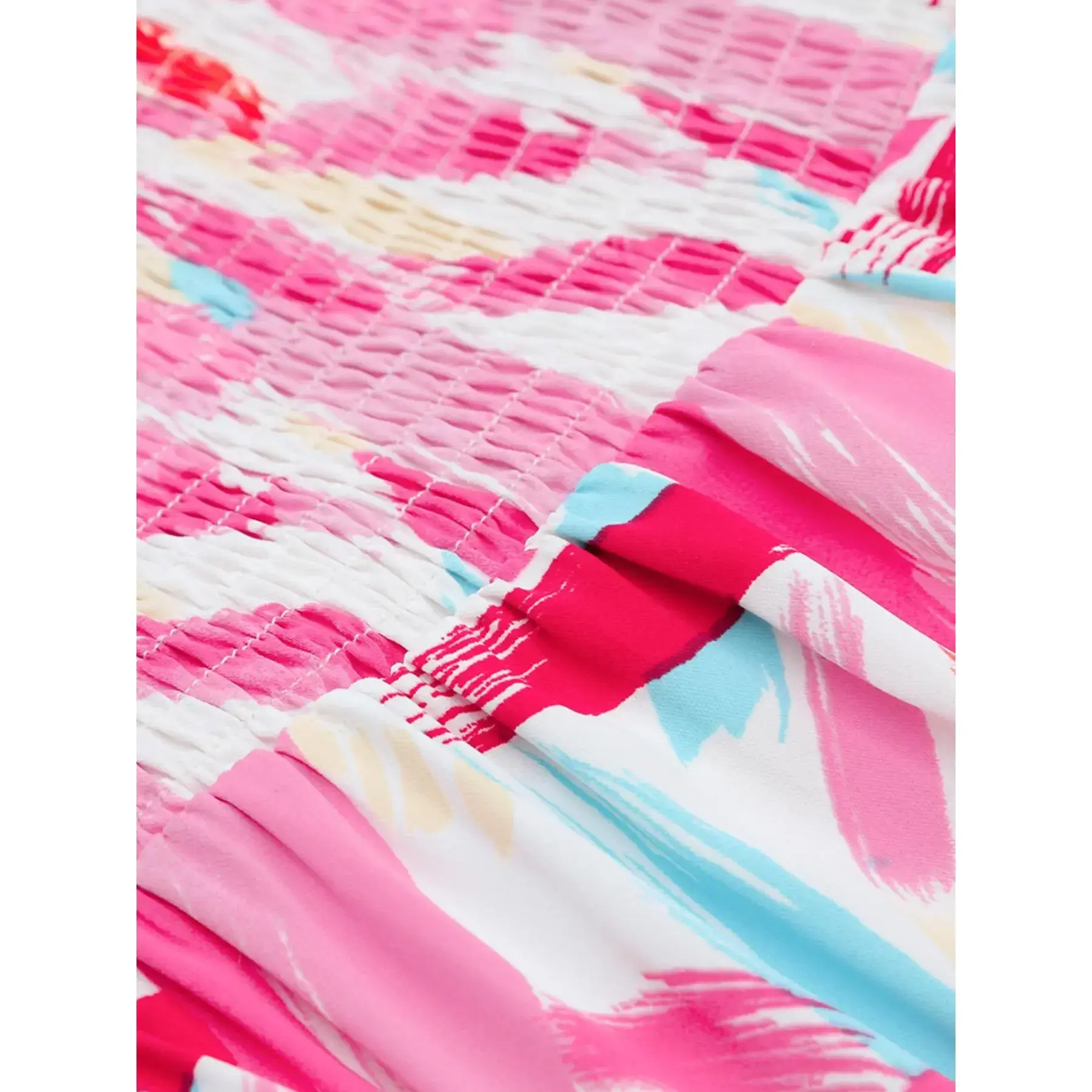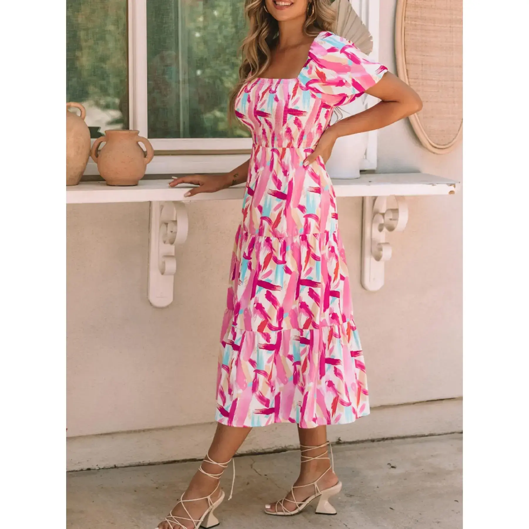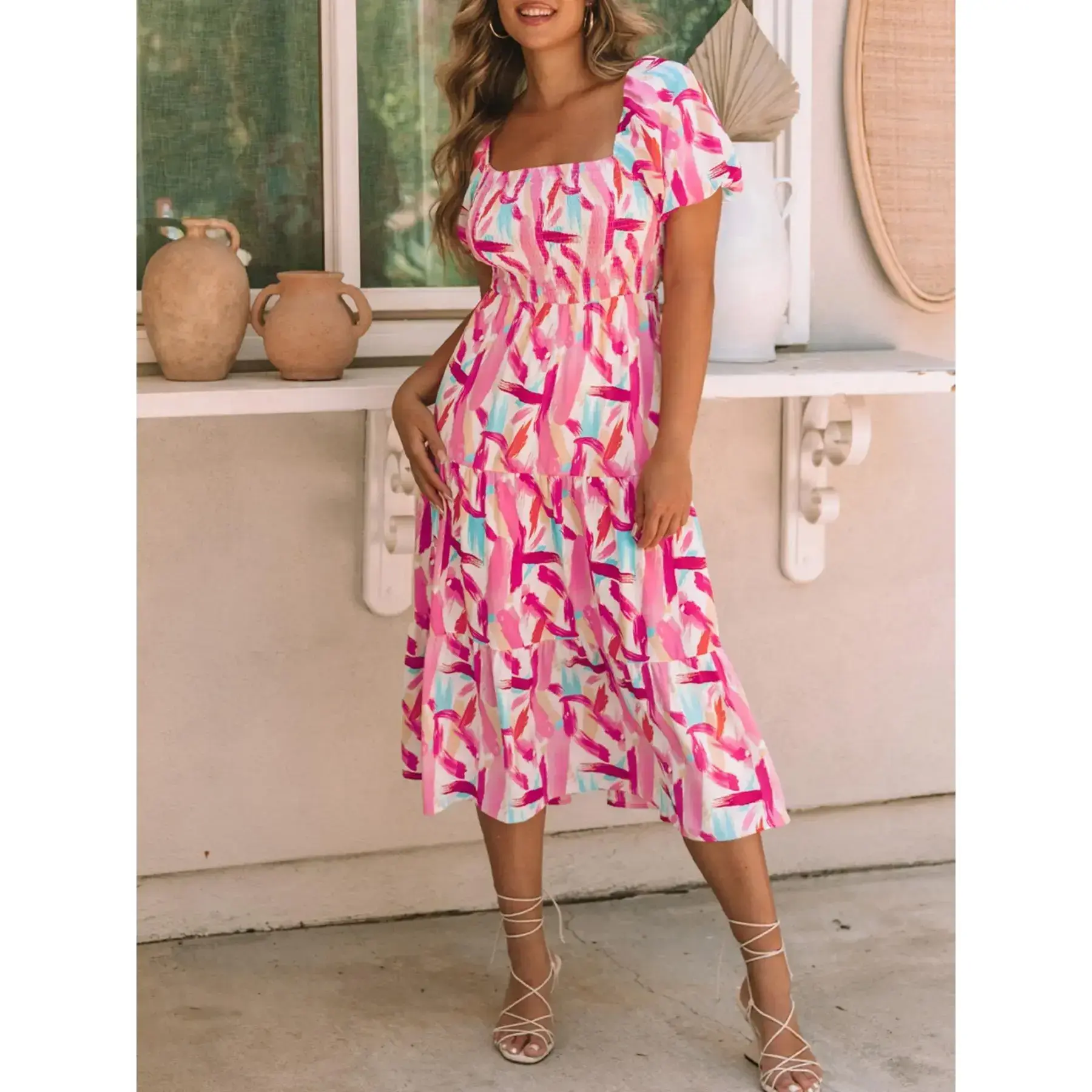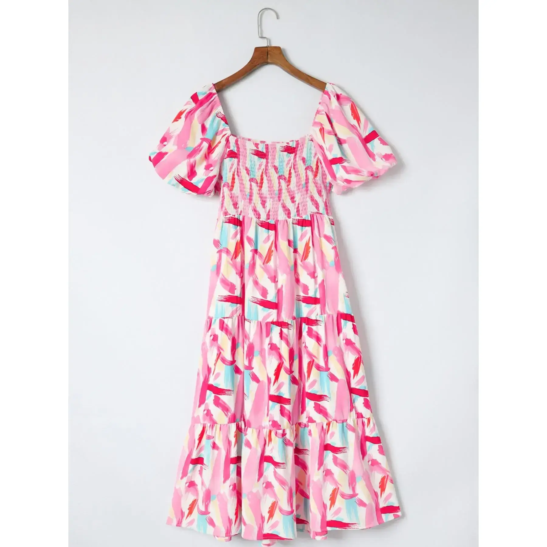 Women's elegant mid length dress with all-over print, smocked bust, ruffled details and tiered layers