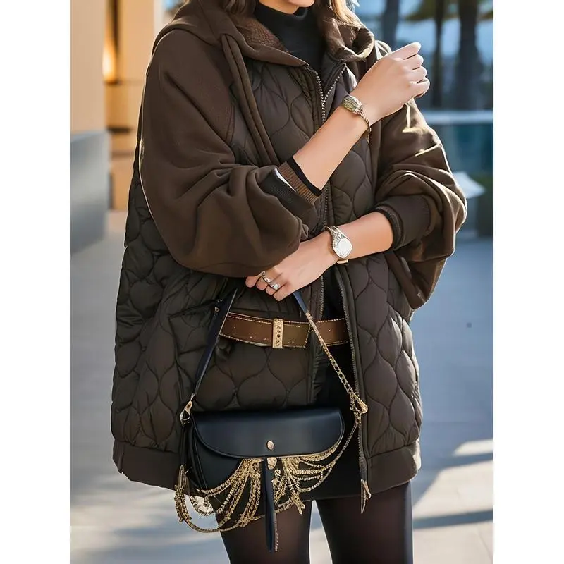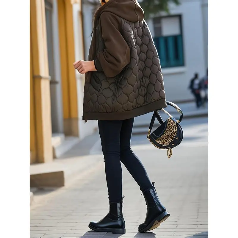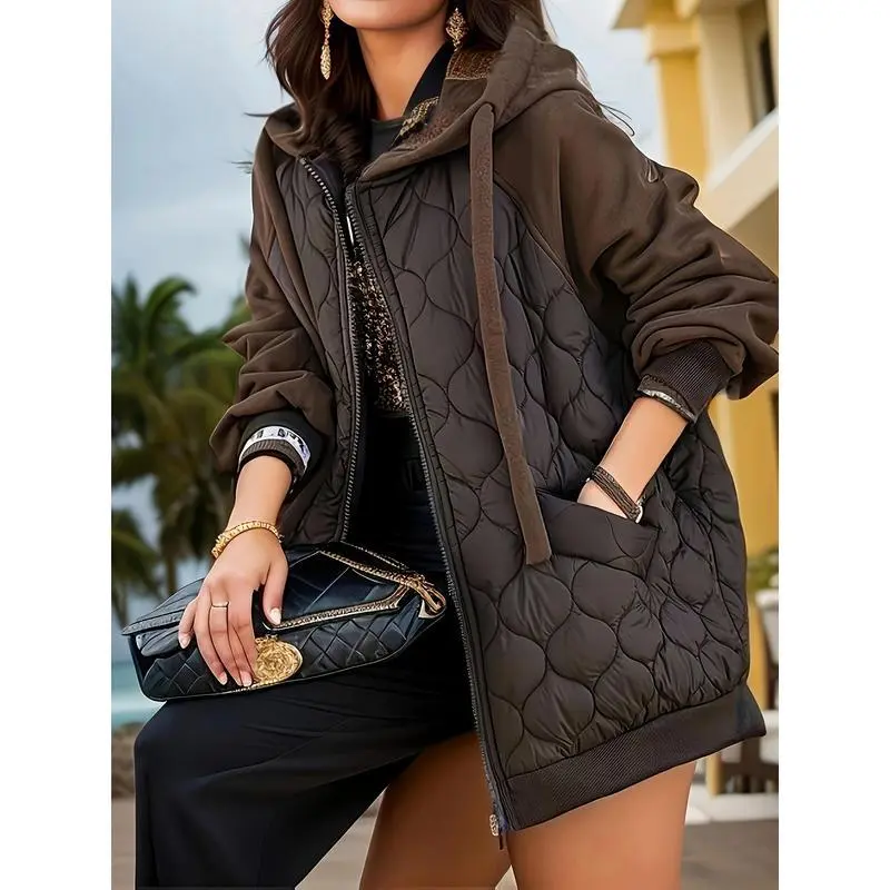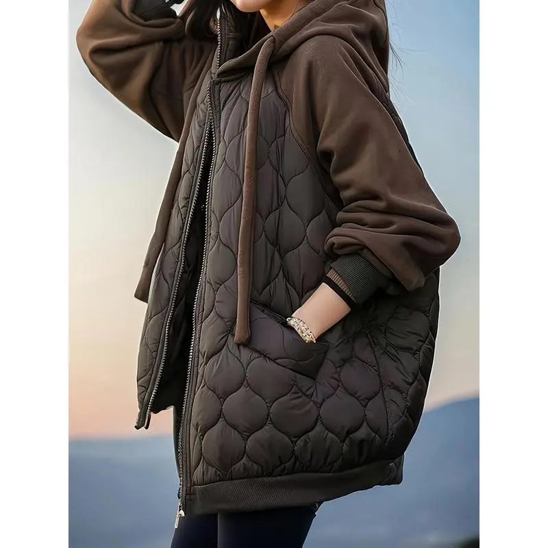 Quilted Drawstring Hooded Zip-up Padded Jacket Coat, Casual Long Sleeve Warm Outerwear For Winter, Women's Clothing