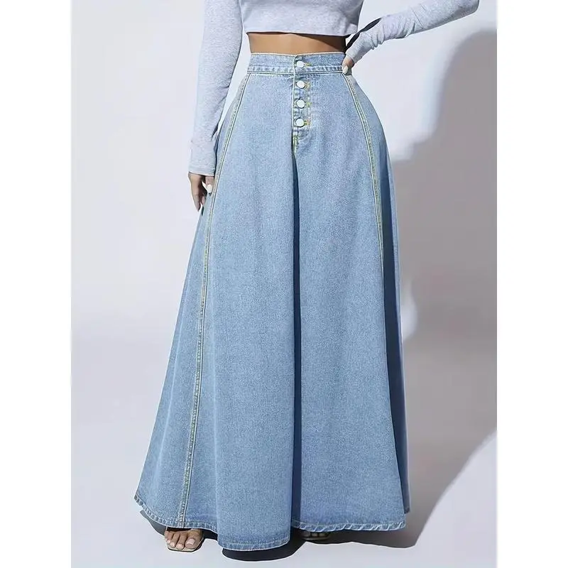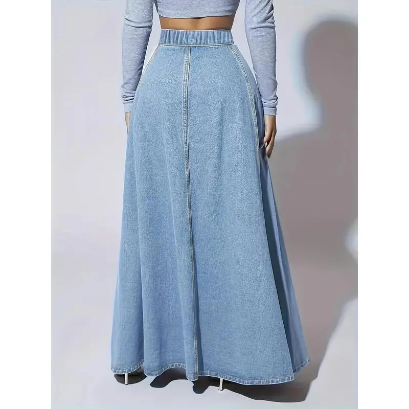 ElegantWashedDenimSkirt,HighRiseButtonFlyA-lineMaxiSkirt,Women'sClothing