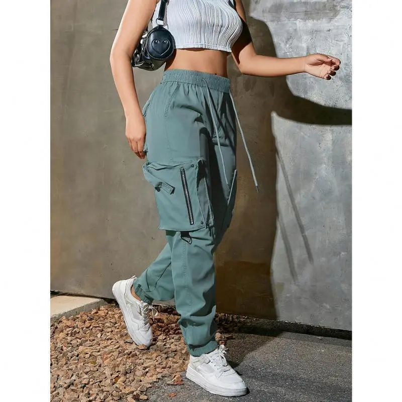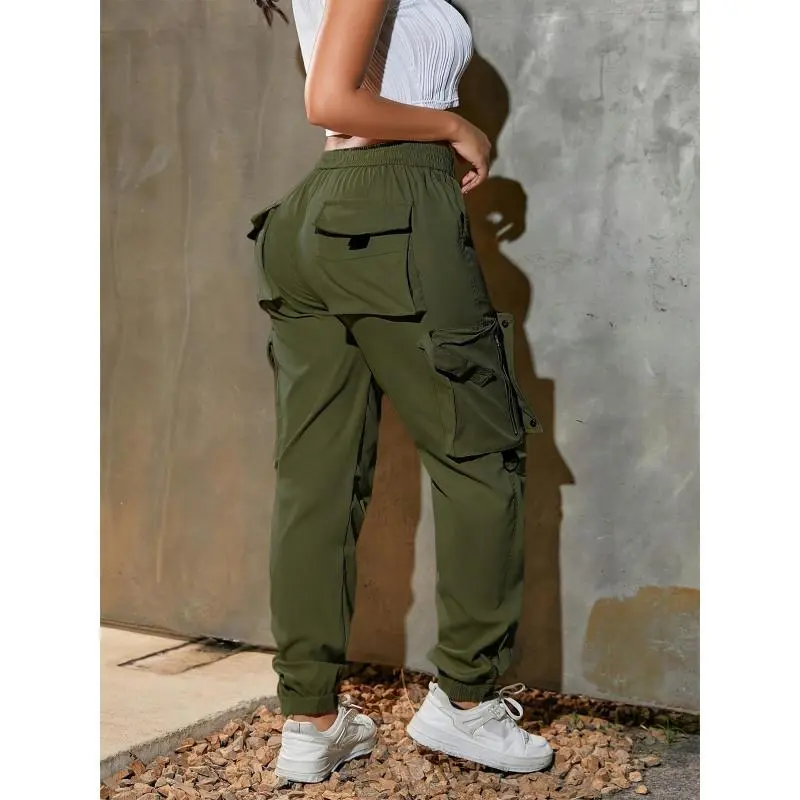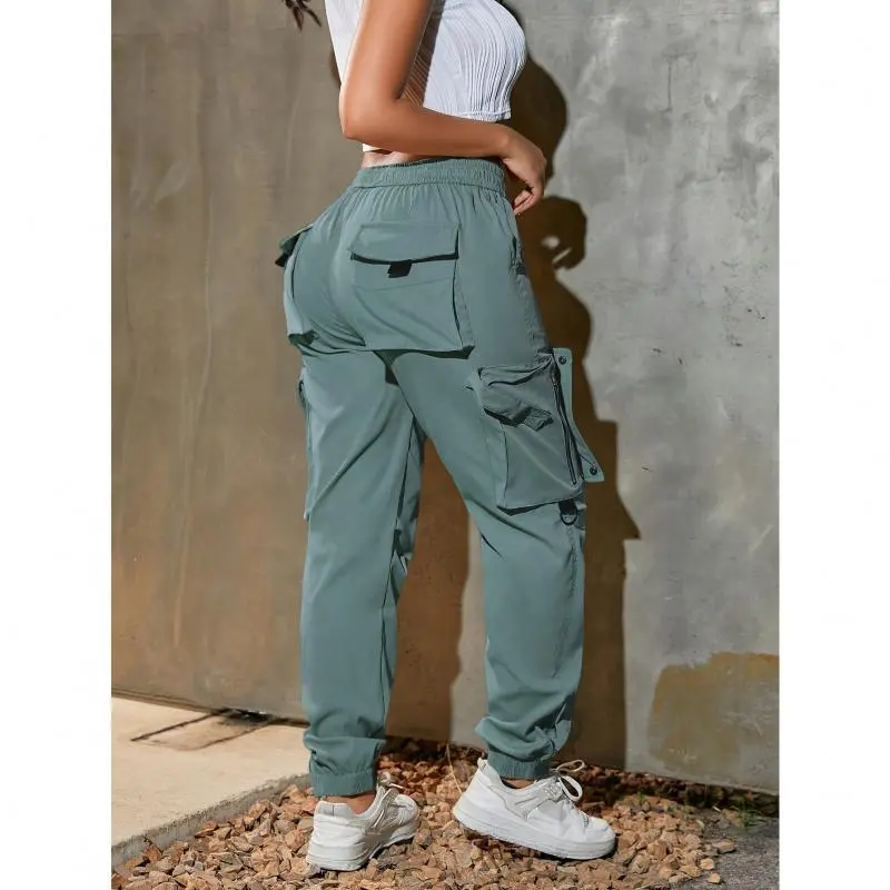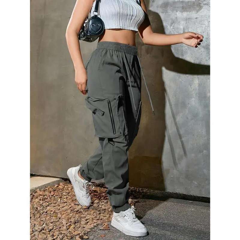 Women's high-waist wide-leg cargo pants-casual fashion, soft polyester, drawstring elastic waist, multi-pocket design, comfortable for all seasons, back belt, all seasons cargo pants women