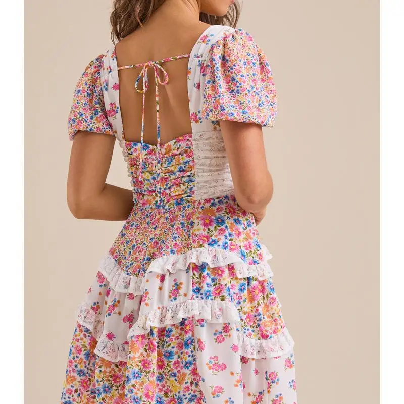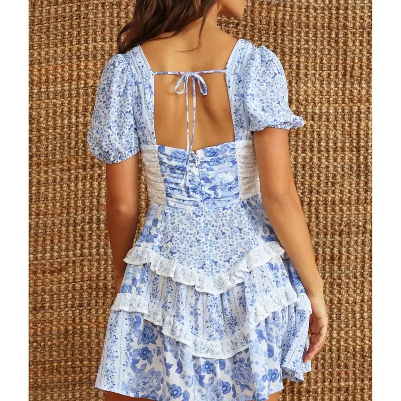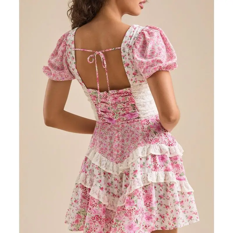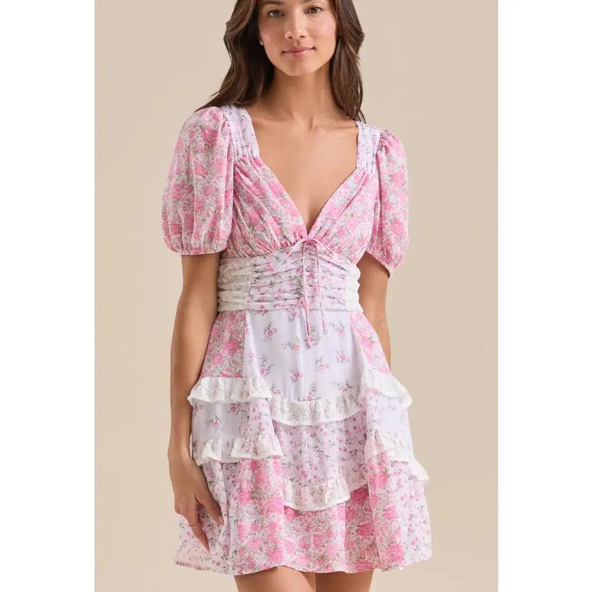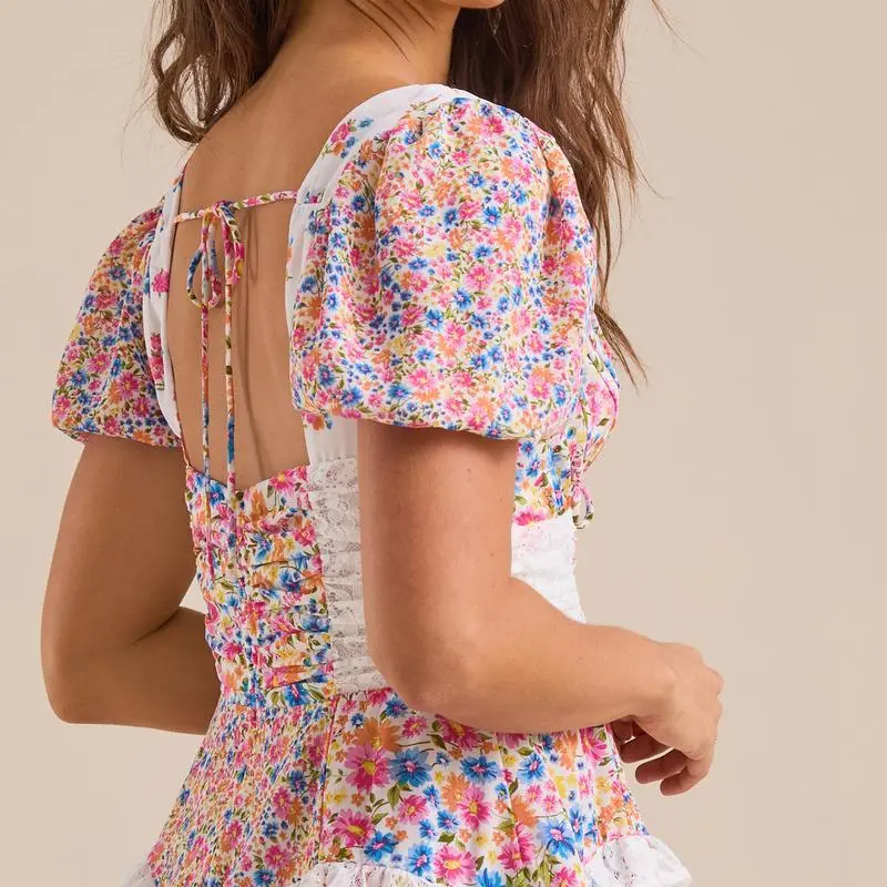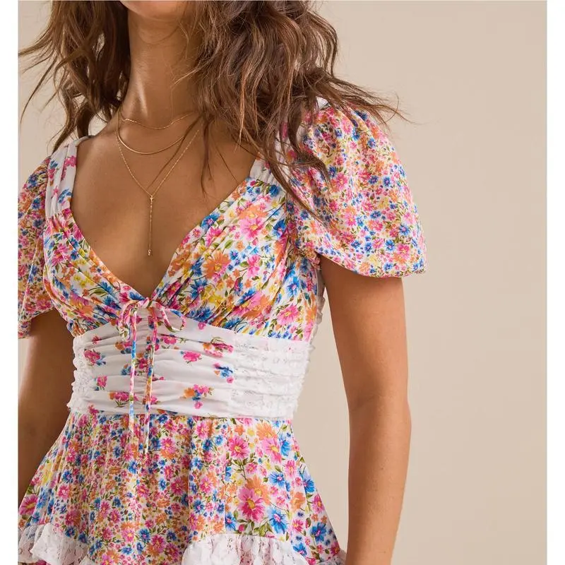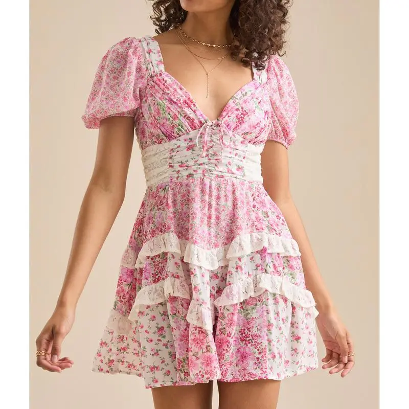 Women's Floral Mini Dress Stylish Tie Bow Lace Trim V Neck Short Sleeve A Line Dress Size (cm)