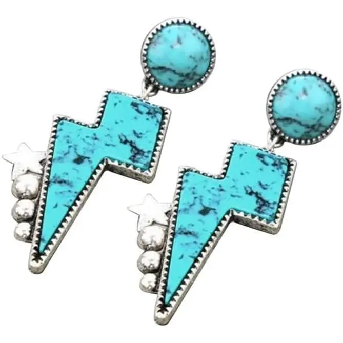 Western Turquoise Lightning Bolt Stud Earrings Natural Green Stone Thunder Flash for Women Cowgirls Punk Party Statement Jewelry