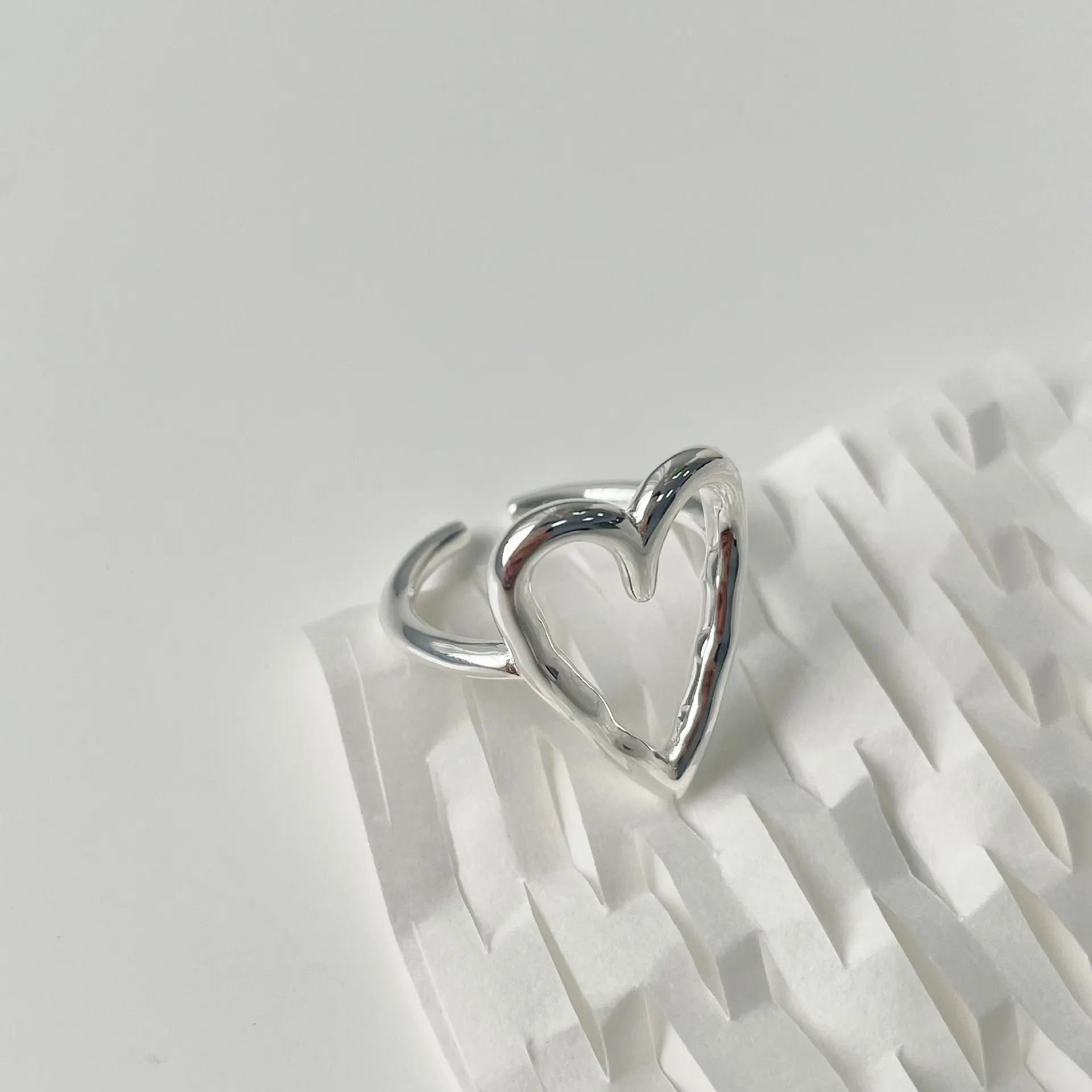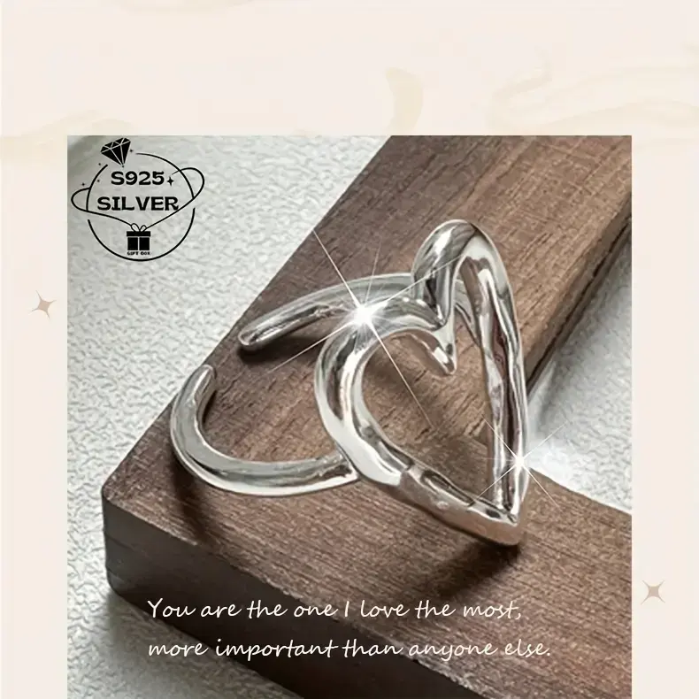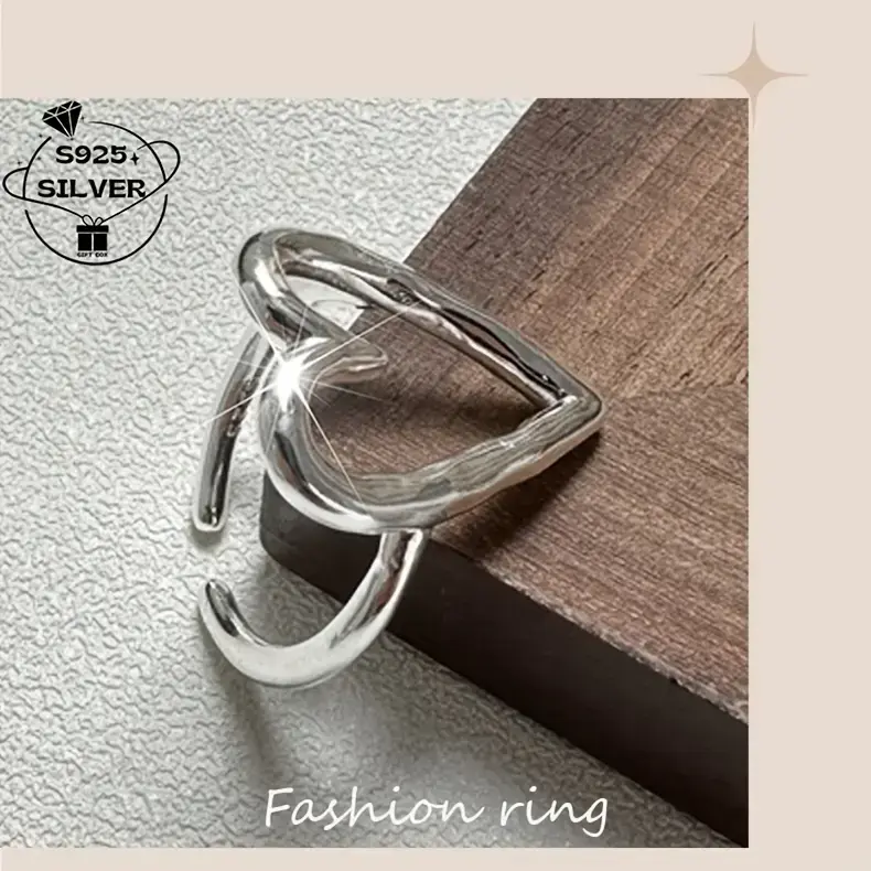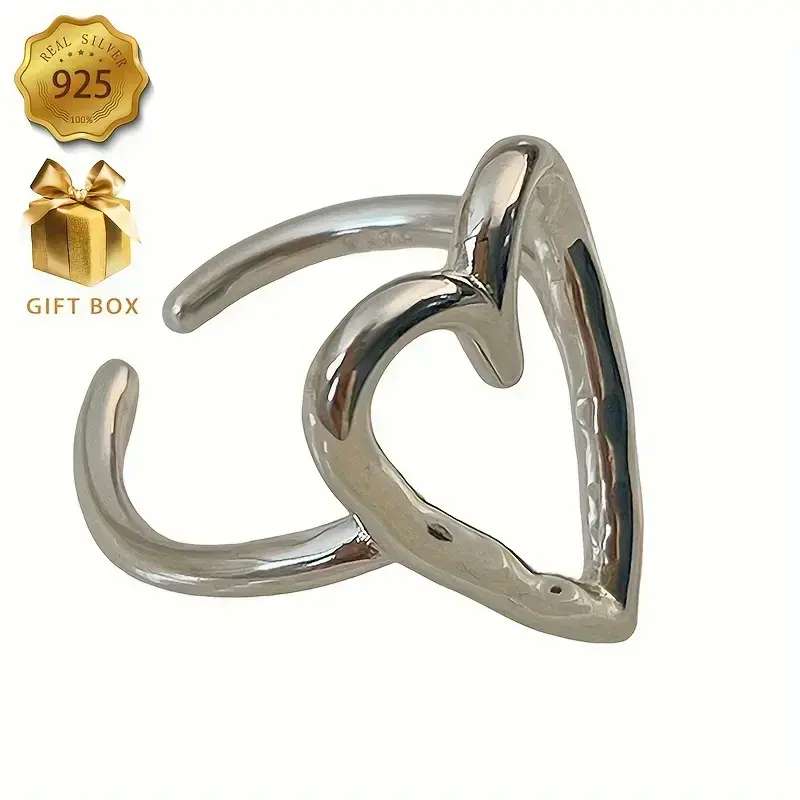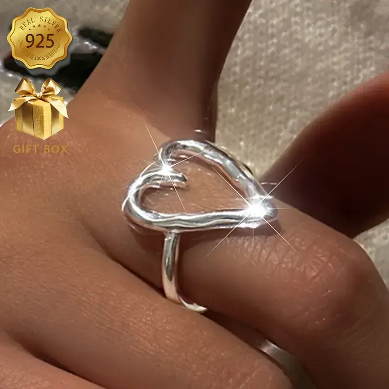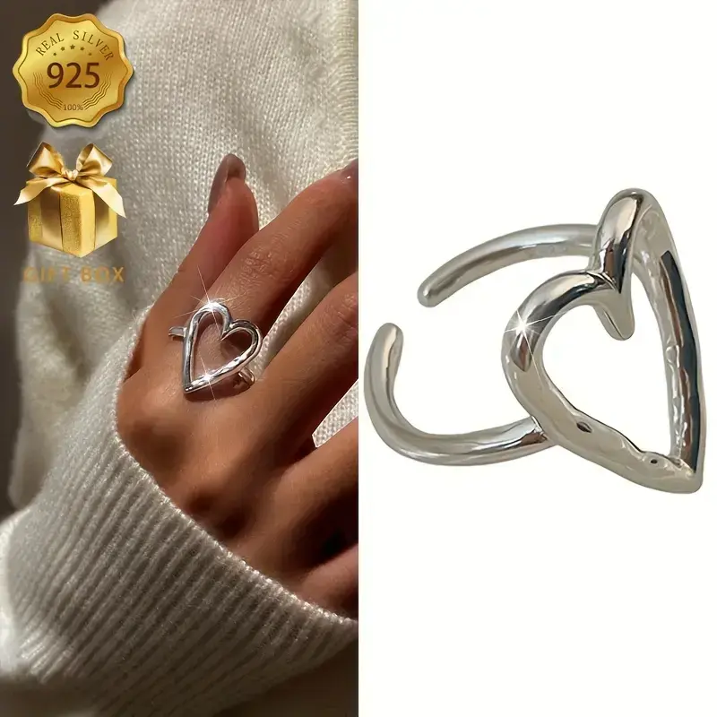 1pc Elegant 925 Sterling Silver Hollow Heart Adjustable Ring for Women - Allergy-Free, Versatile for Daily Wear & Gifting, Simple Style, Year-Round Fashion Jewelry