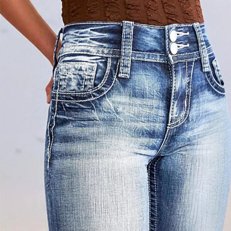 Women'sjeanswithcowheadembroidery,vintagestyle,versatileandcomfortableinallseasons,washedblueflaredjeansDenimCottonFitWomenswear