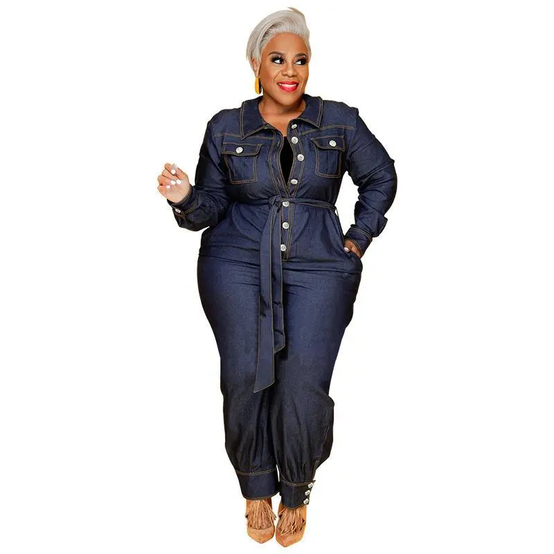2025SpringNewProductWomen'sDecorativeV-neckCasualLargeSizeDenimJumpsuitsClothesOverallsCottonFabric