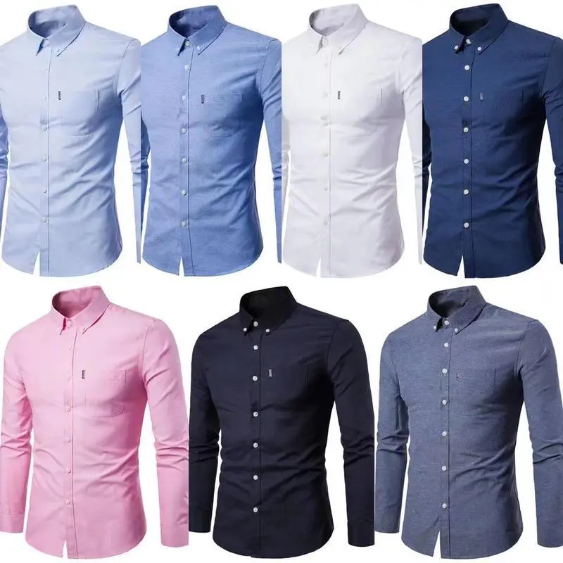 OxfordCottonLongSleeveShirtMen'sFittedSolidColorCasualWearforMiddle-AgedYoungMenTopBeigeWhiteLapelNecklinePocket