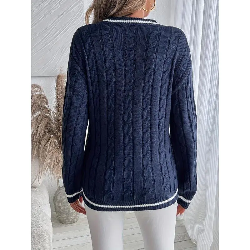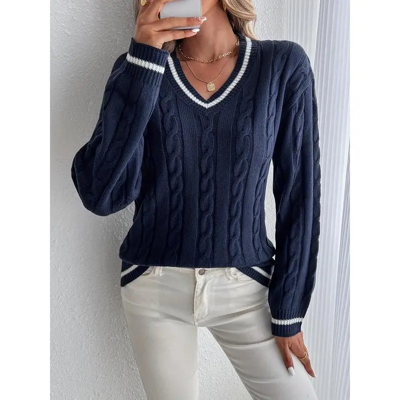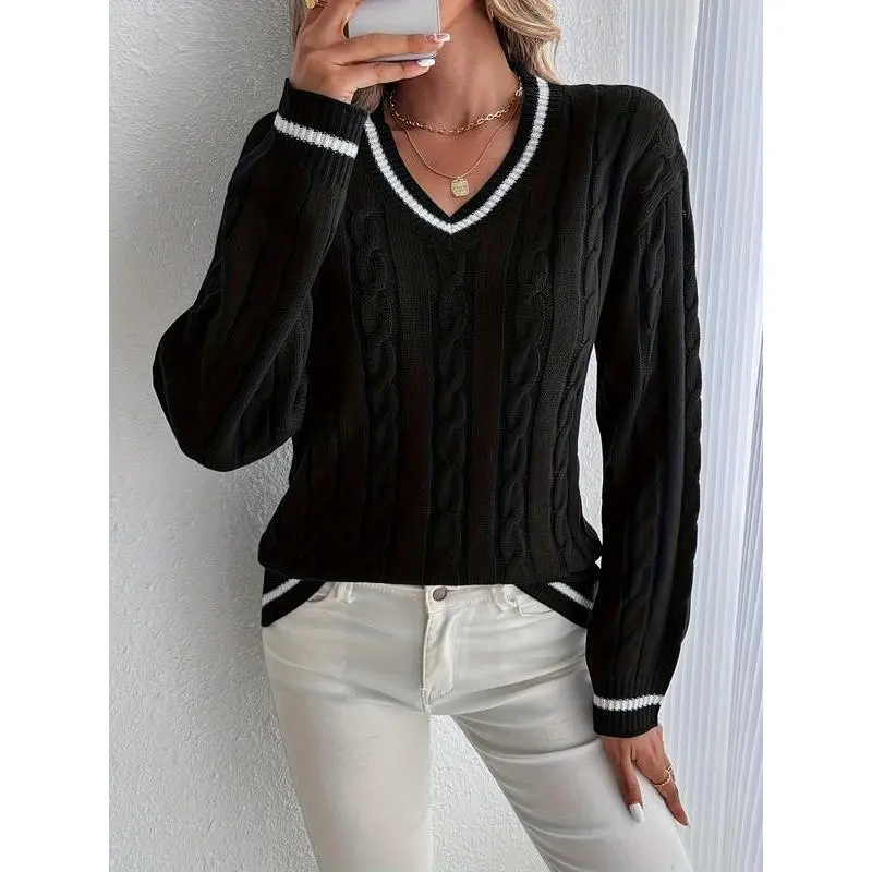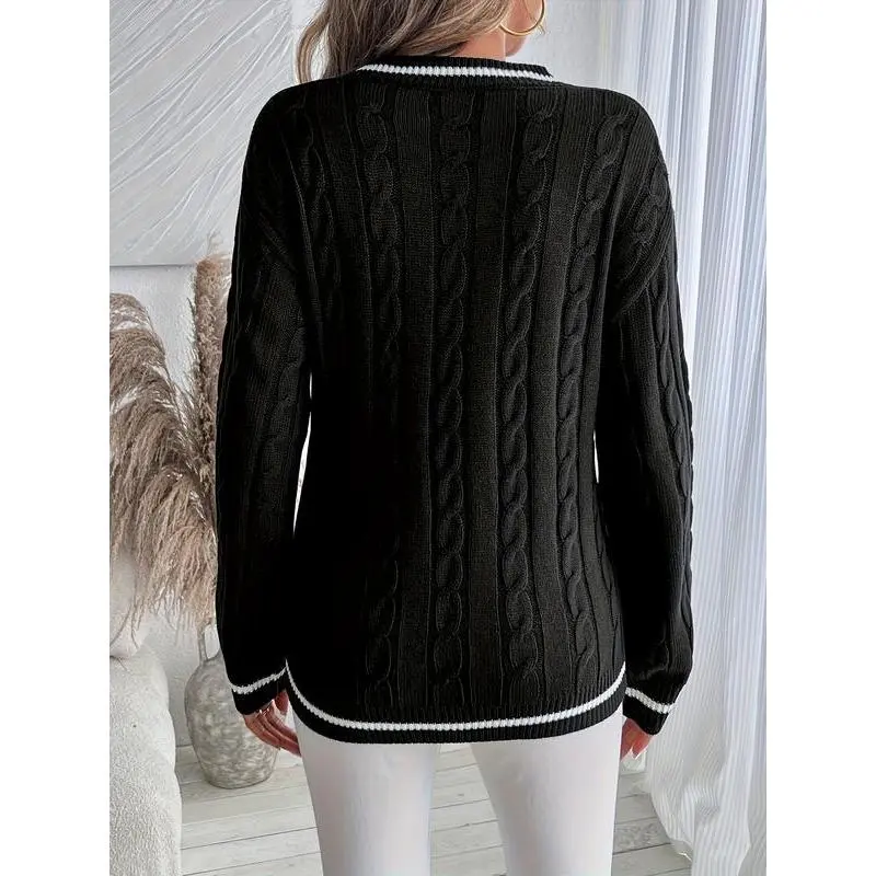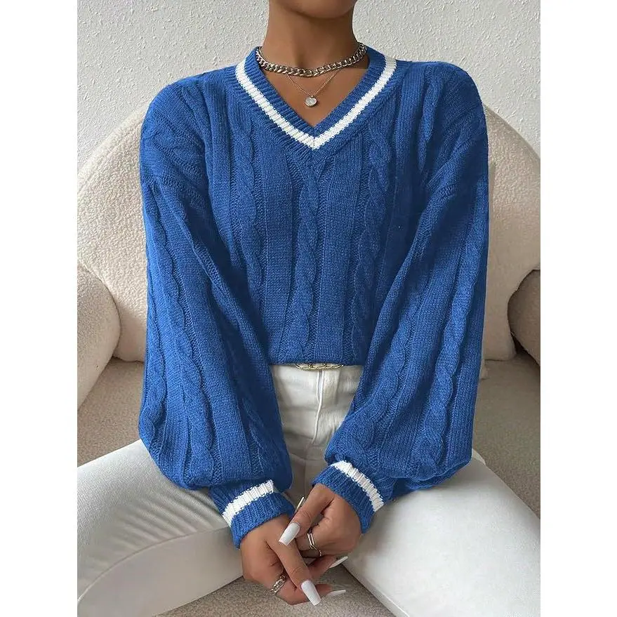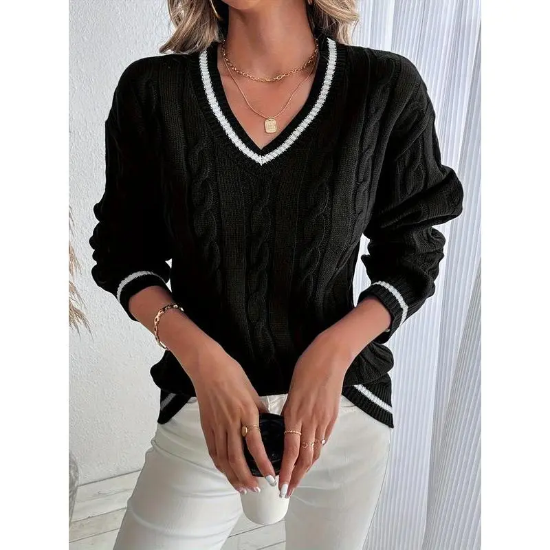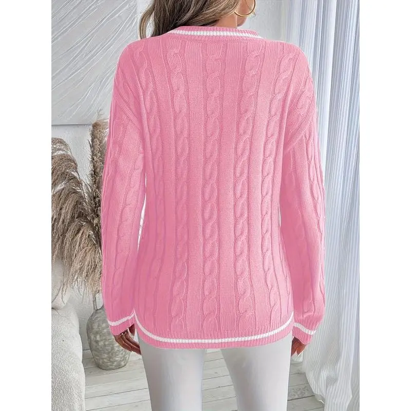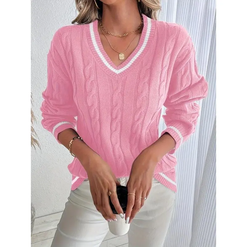 Women's Knitted Sweater for Fall and Winter, Trendy V-Neck Design with Pattern, Casual Pullover Knit Top for Ladies