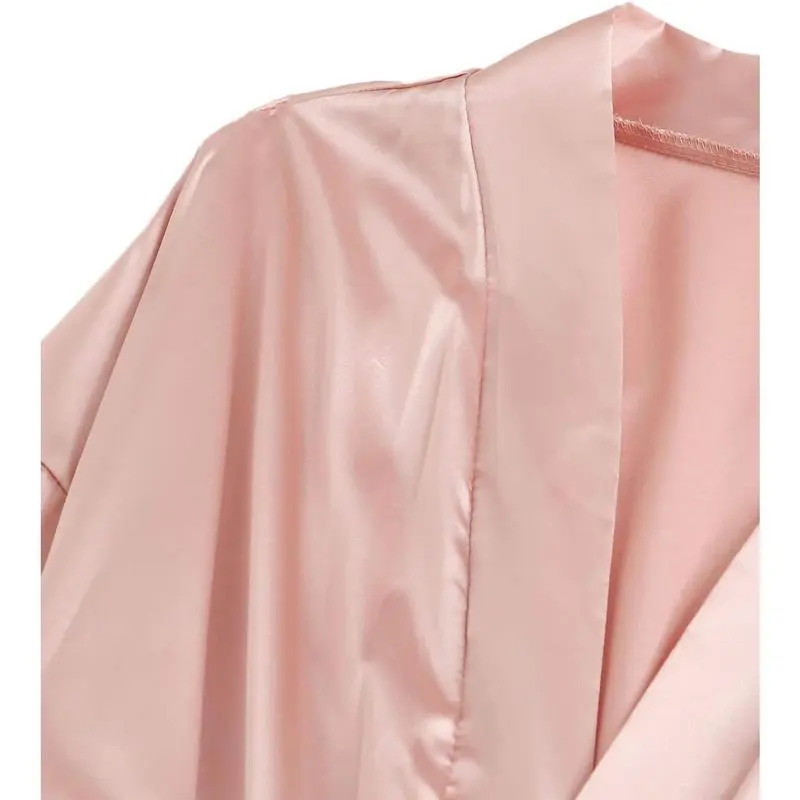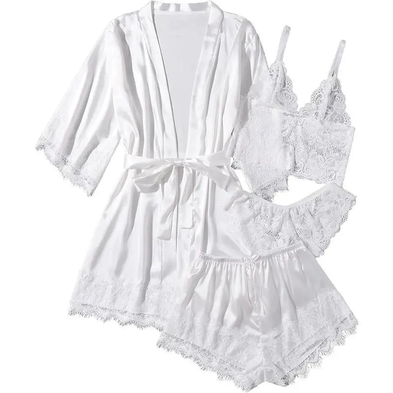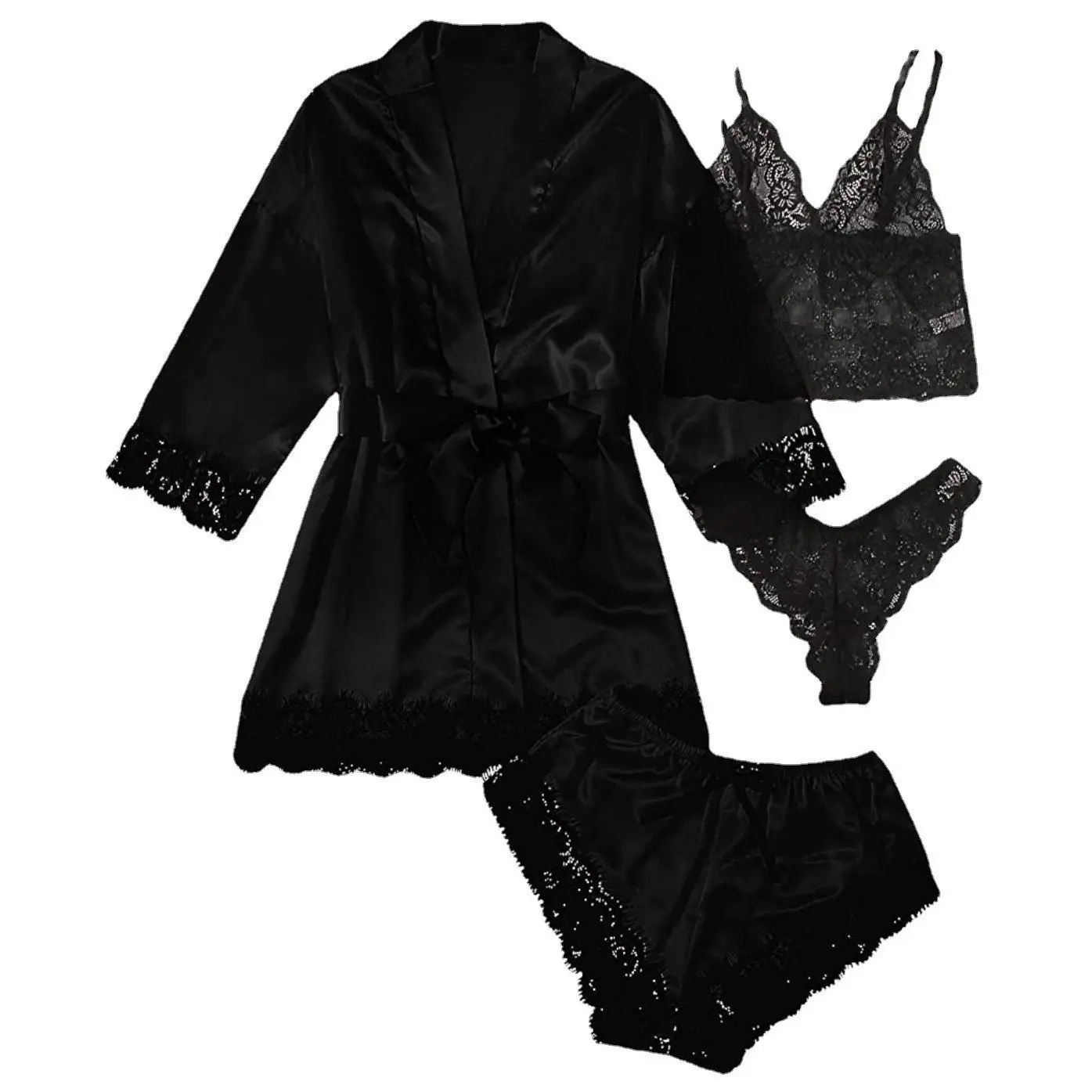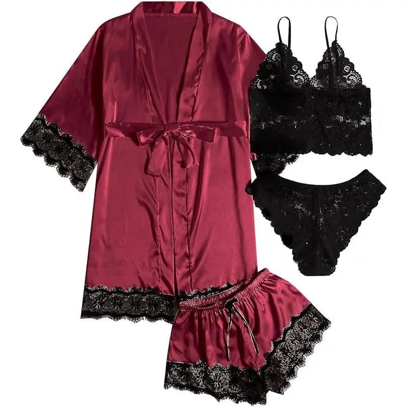 Women'sSatinPajamaSet4pcsFloralLaceTrimCamiLingerieSleepwearwithRobeCasualFabric