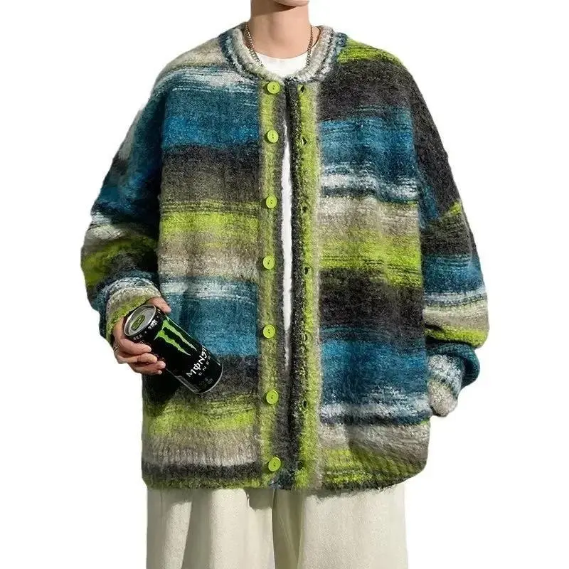 2025 men's color matching crew neck, sweater, new autumn and winter for teenagers, loose, fashionable casual knitted cardigan