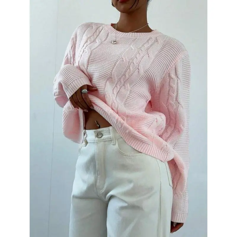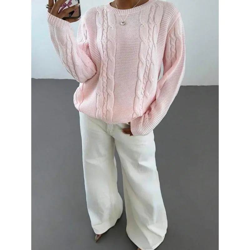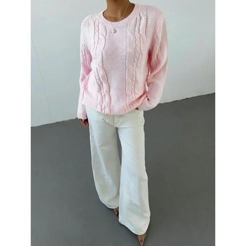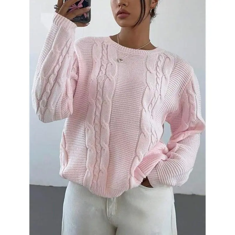 Women's Cable Knit Crew Neck Long Sleeve Loose-Fit Pullover Sweater, Autumn/Winter Solid Color Casual Flowy Soft Lightweight Cozy Chic Knitted Sweater Top, Women Fall Outfit, Winter Sweater for Women