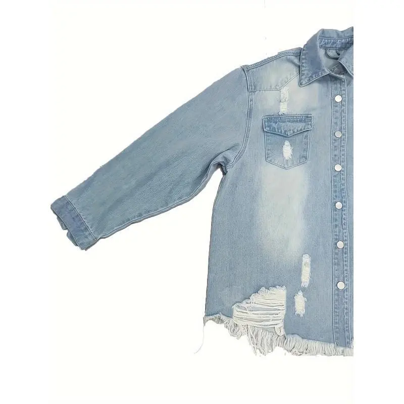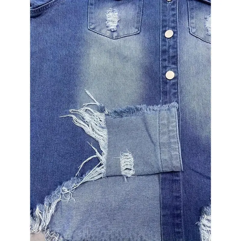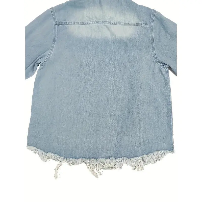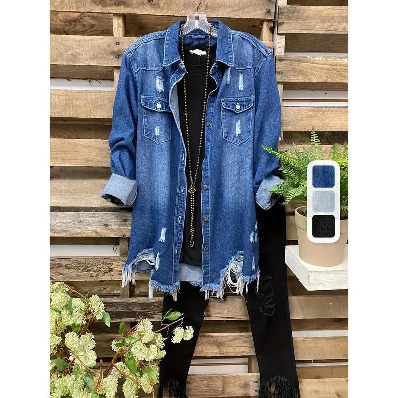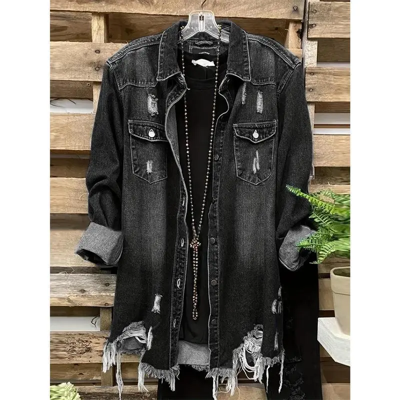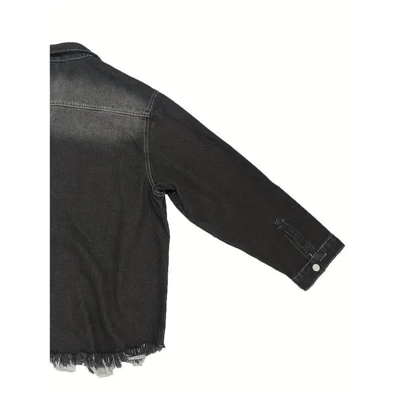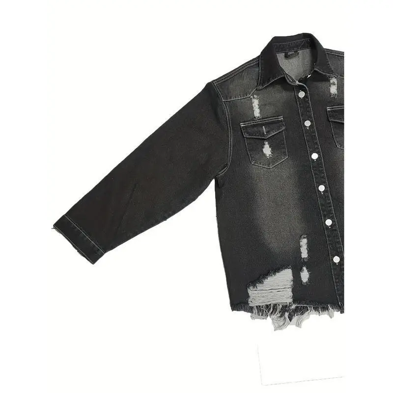 Plus Size Casual Denim Top, Women's Washed Ripped Button Long Sleeve Lapel Frayed Denim Shackles