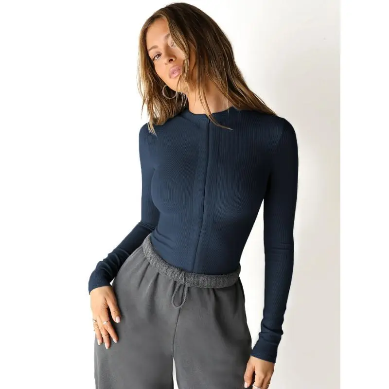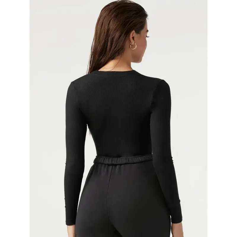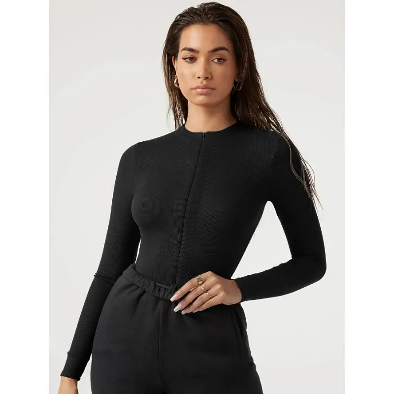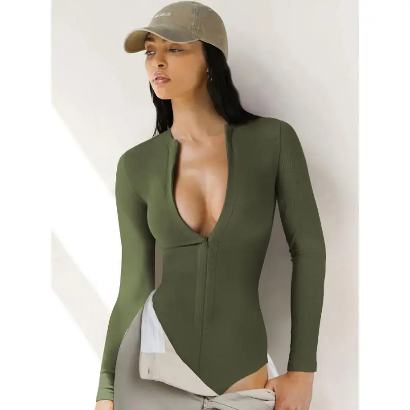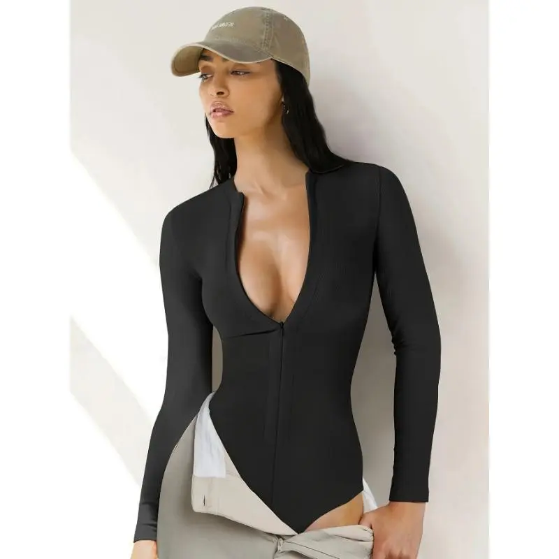 ZipUpVNeckBodysuit,SexyLongSleeveVersatileSportswearBodysuit,Women'sClothing