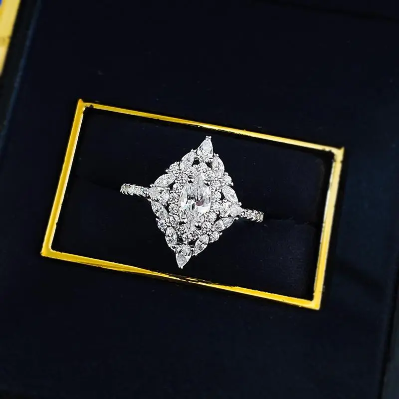 【966】Art Deco Geometric Marquise Ring | 4x8mm White Marquise Zirconia Center | Double Halo | Full Pave Band
