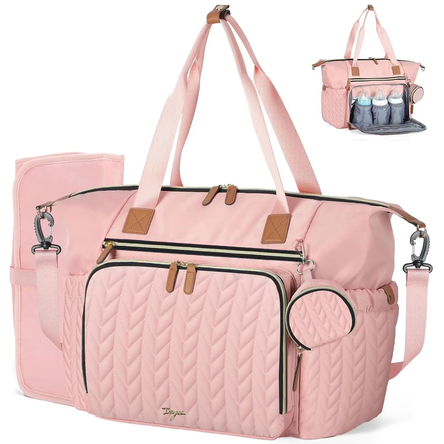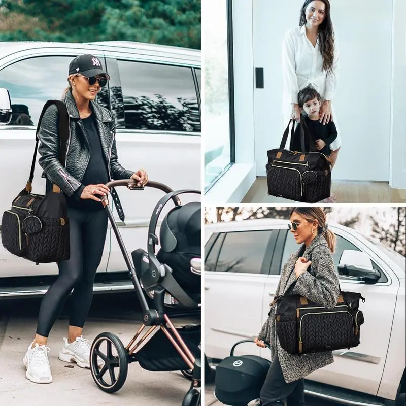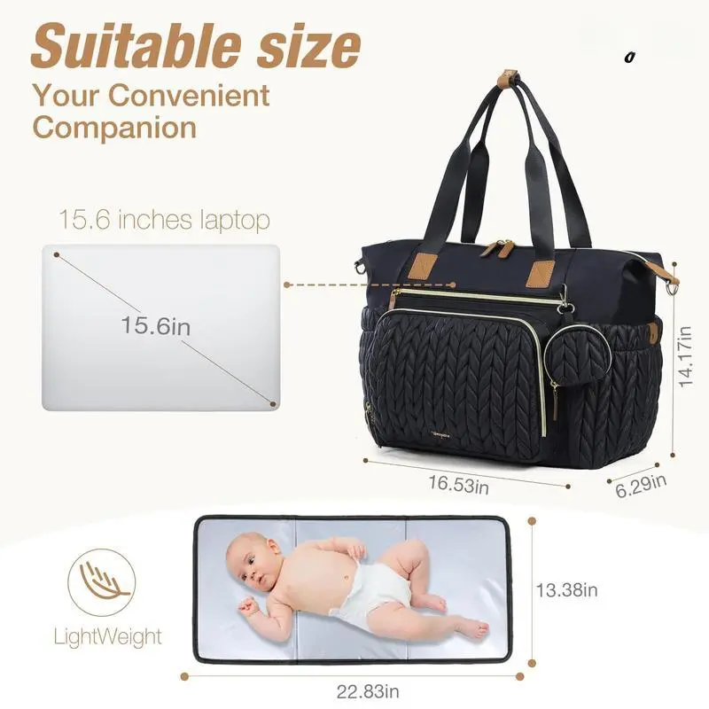 Quilted Materials: diaper bag with 3D herringbone nylon quilting,achieve ablend of practicality and fashion. While studded feet in the bottom keep the bag clean and off the ground Comfortable and Durable:baby diaper tote is made of tear-resistant fabric, strong zippers and lining, it is lightweight but durable enough to sustain heavy weight Large Capacity:The Large diaper bag have plenty of room to hold everything you andneed. With 16 pockets keepstuff,including a convenient pocket for easy access to wet wipes and three stable thermal bottle compartments,this bag ensures organized storage for your baby's essentials Easy to Carry:Baby diaper bag tote with portable changing pad is equipped with a detachable shoulder strap, flexible carrying method allows you to easily carrybag as a crossbody bag,shoulder bag or handbag.The handy Luggage sleeve design makes travel a breeze Meaningful Gifts:Luxury diaper tote is a practical gift and should be on everyregistry. It makes for a greatgift and a great gift for mom and dad,offering a sleek look that appeals to parents while serving as a versatile everyday bag for both casual and semi-formal occasions