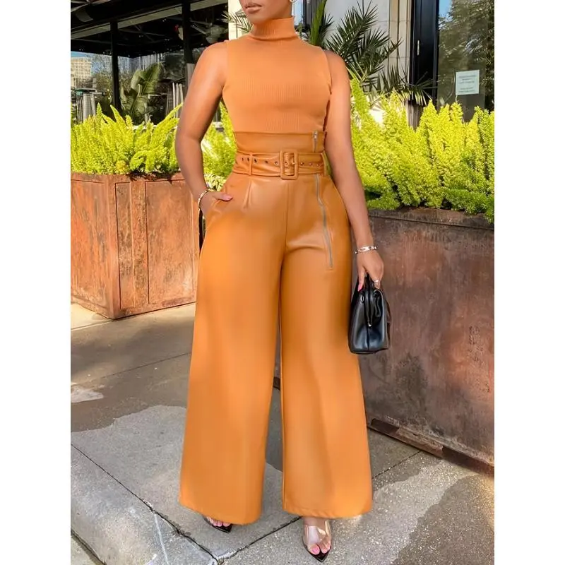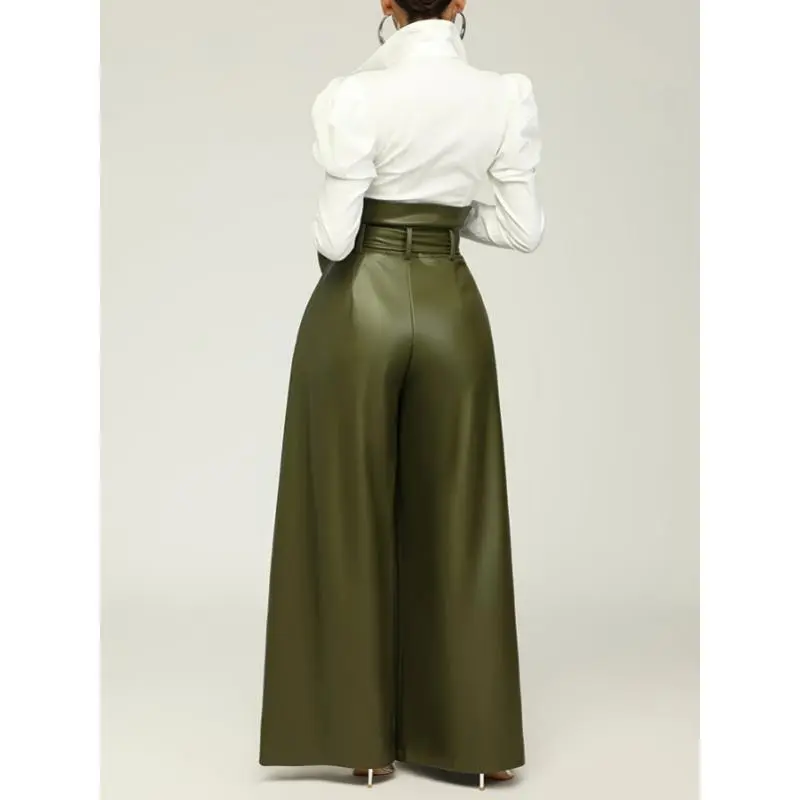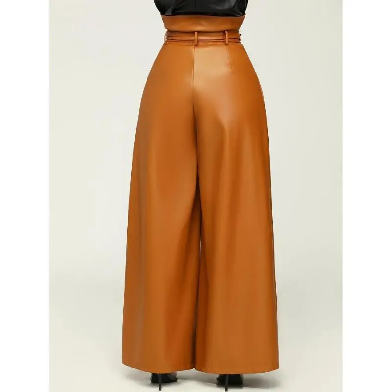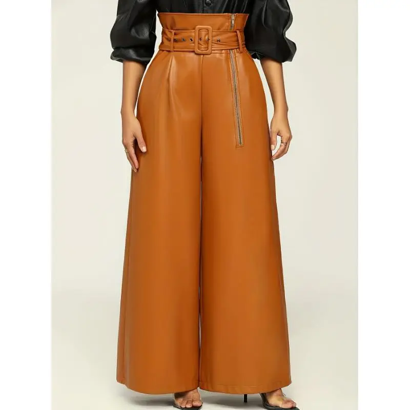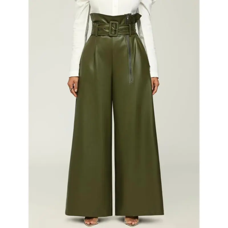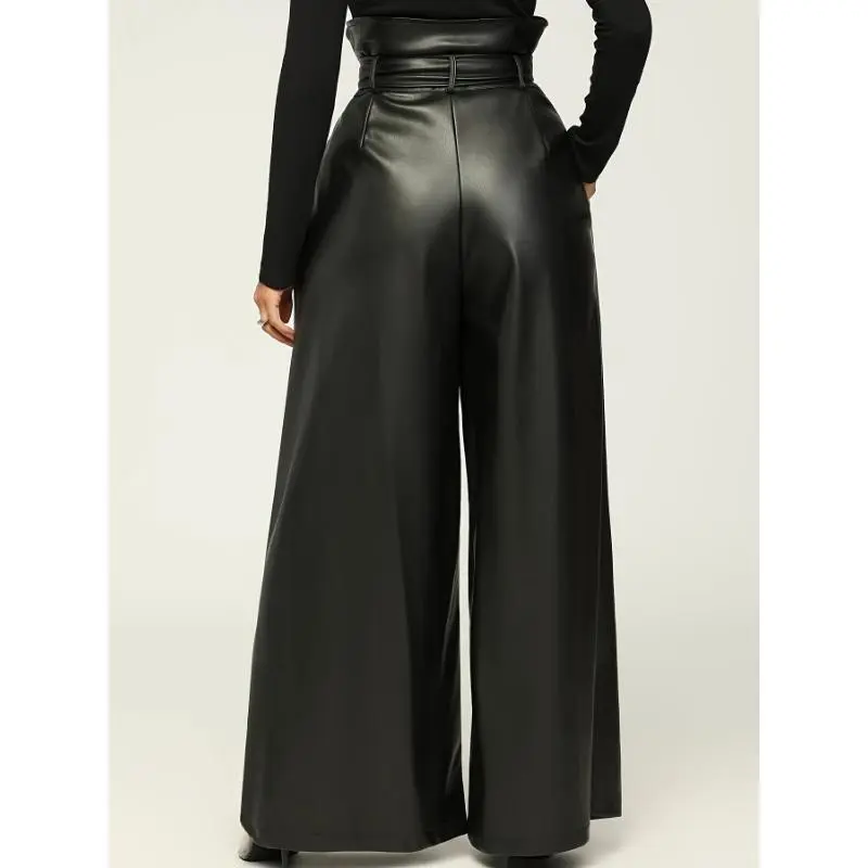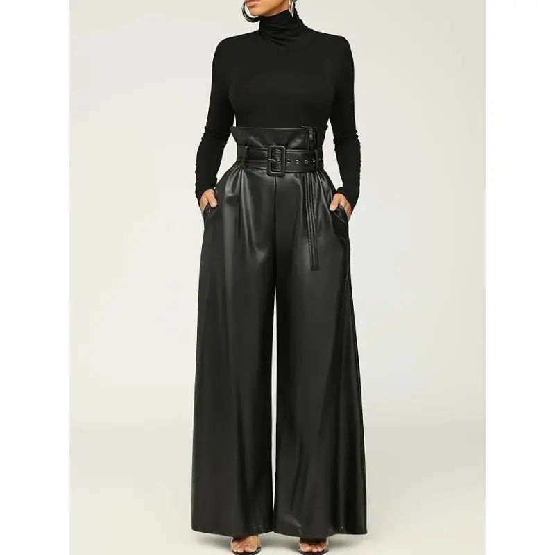Women's High-Waisted Wide Leg Pants with Metallic Belt Detail - Elegant Solid Black, All-Season Fashion Trousers for Adults, Ladies Pants Fabric Womenswear