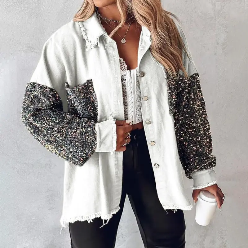 Women's Colorblock Sequin Patchwork Long Sleeve Jacket Top Button Front Raw Hem Shacket