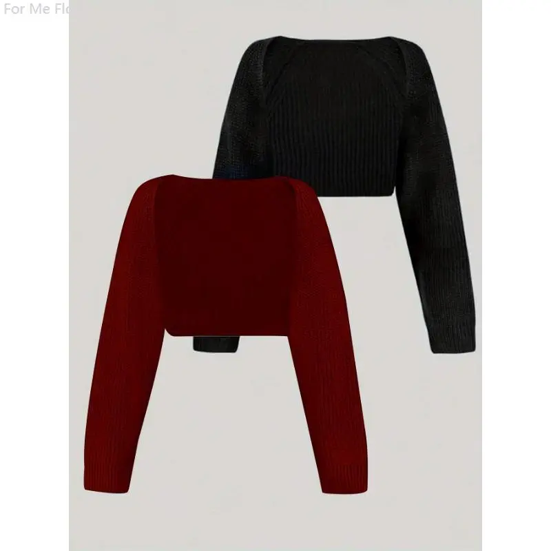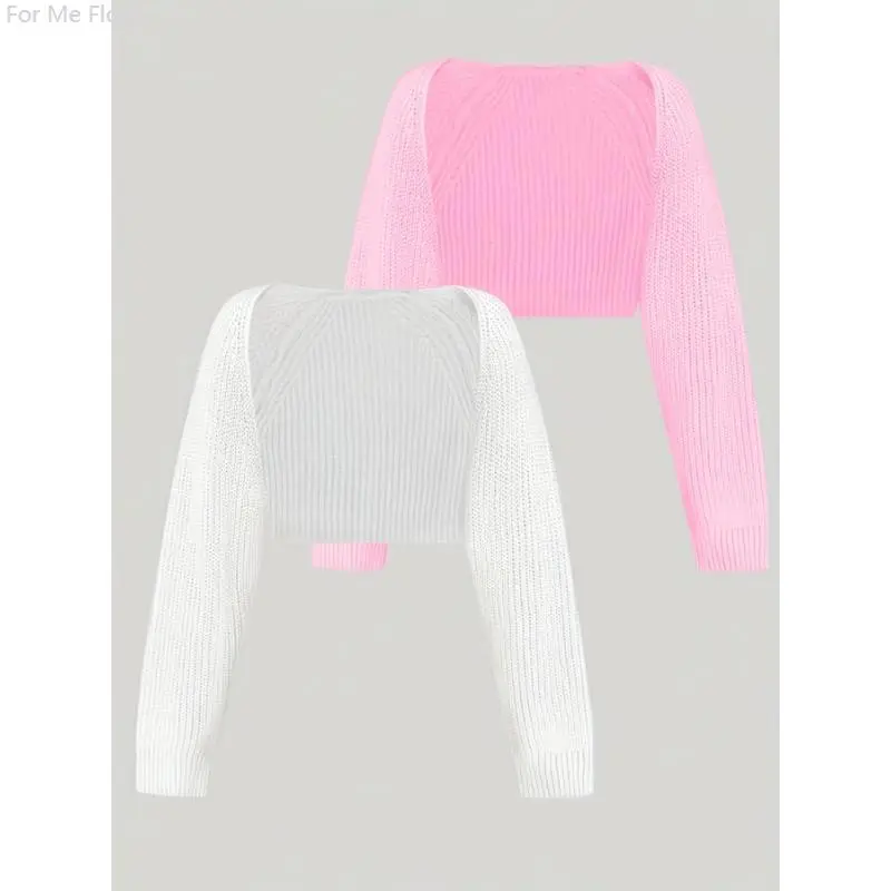 Store Solid Color Knit Crop Cardigan 2 Packs, Elegant Long Sleeve Shrug For Spring & Fall, Women's Clothing