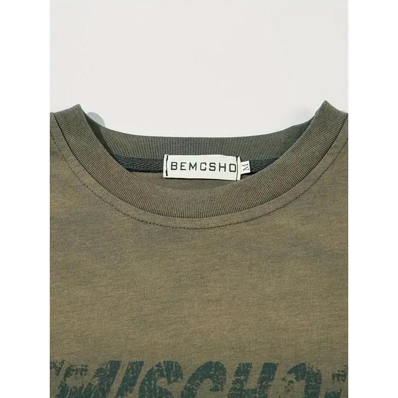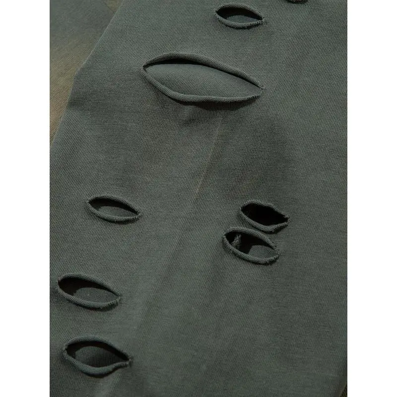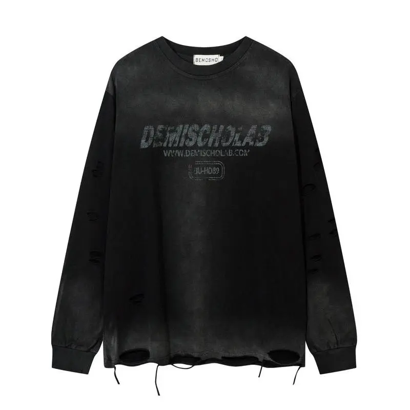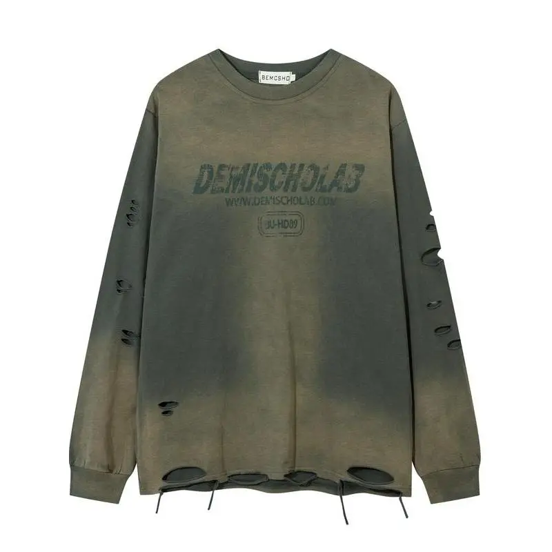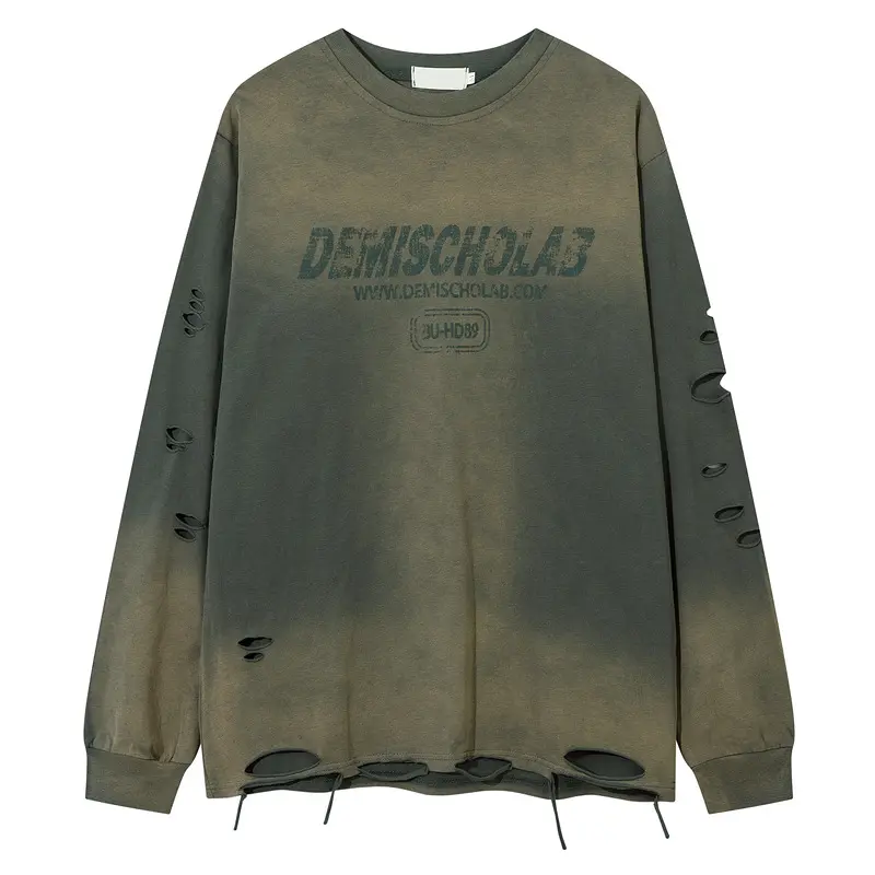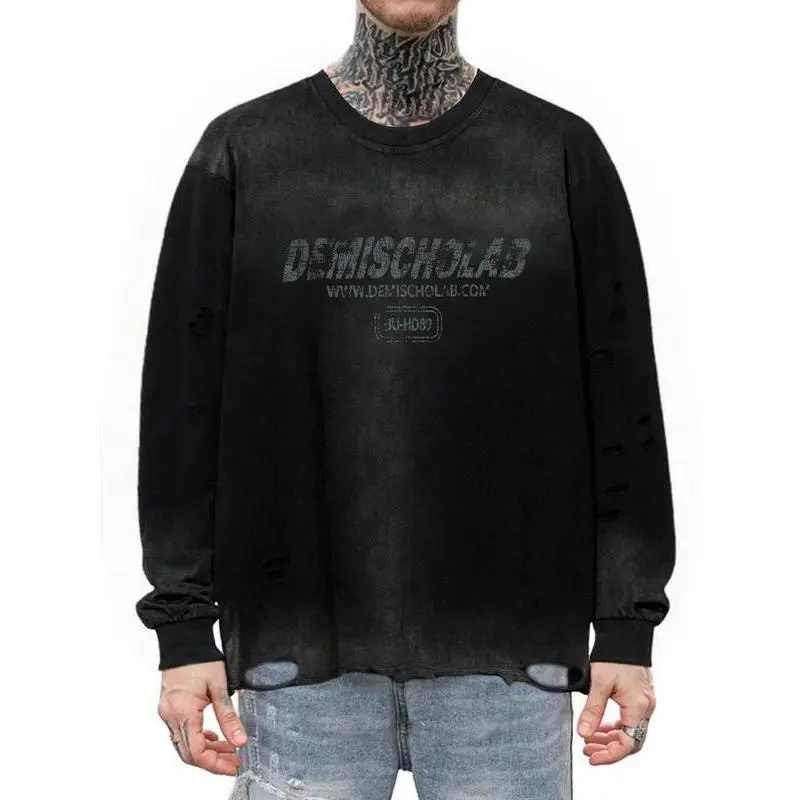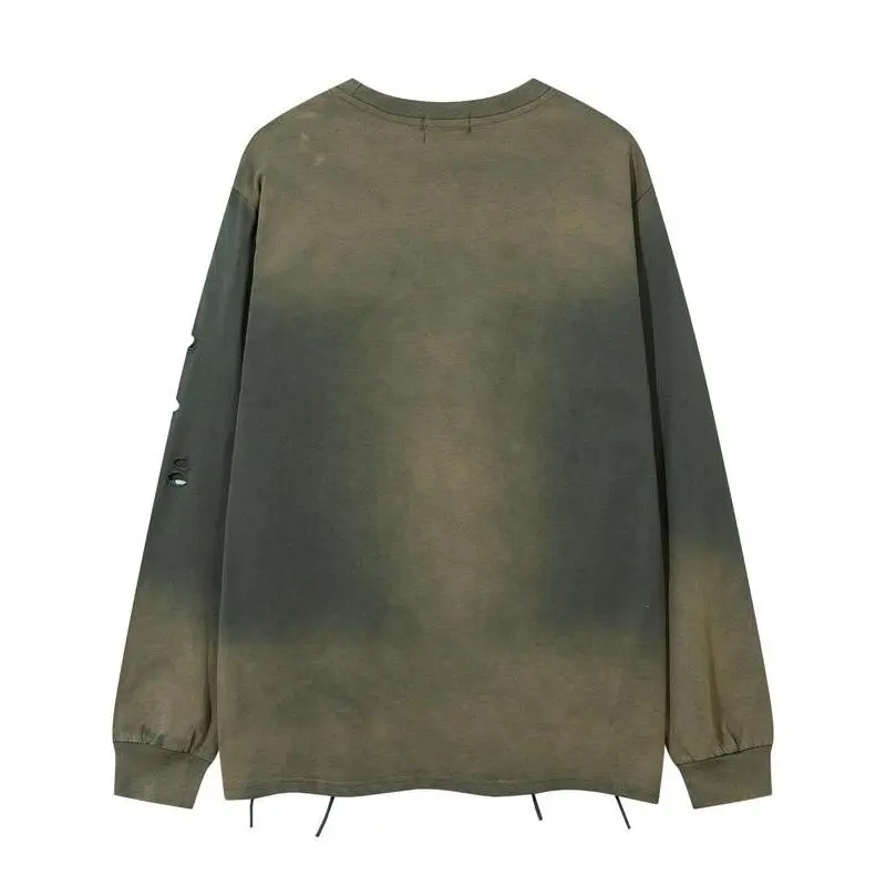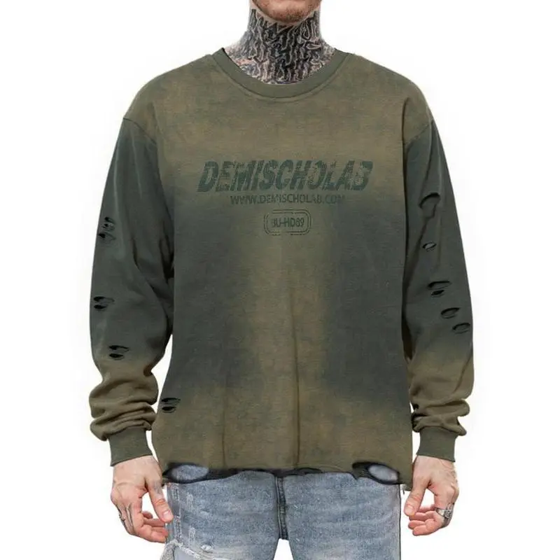 Men's Vintage Wash Tie-Dye Ripped Faux Fur Letter Print Sweatshirt, Casual Round Neck Long Sleeve Top, Fall & Winter Fashion