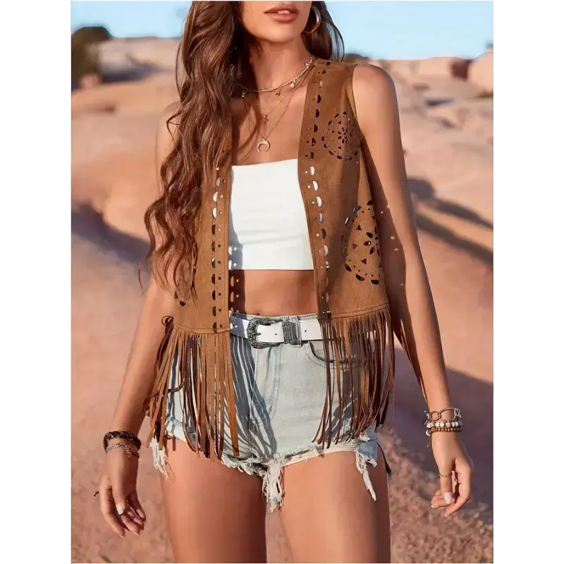 Stylish Ladies Western Cowboy Fringed Vest - Solid Color Loose Fit with V-Neck & Button Details, Machine Washable, All-Season Fashion for Casual Outings & Themed Events, Layering Fashion Piece | Western Fashion | Quality Craftsmanship