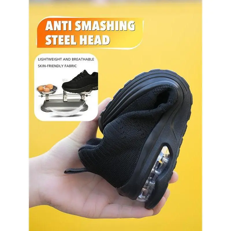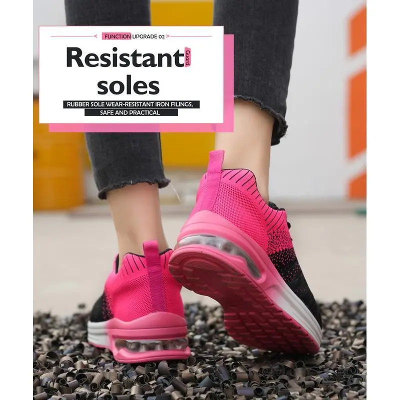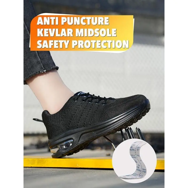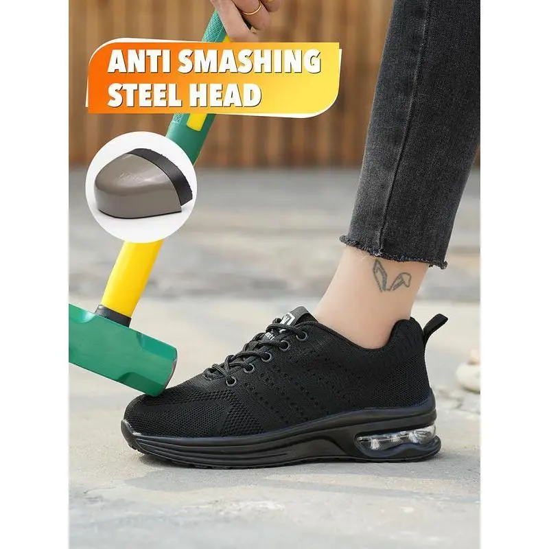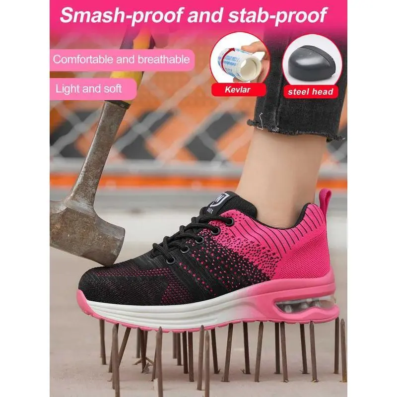 Women's steel-toe sports non-slip air cushion work Safety shoes, made of breathable mesh material, lace-up style, featuring anti-smashing, anti-piercing, Lightweight shock-absorbing and wear-resistant properties. Closed Girl