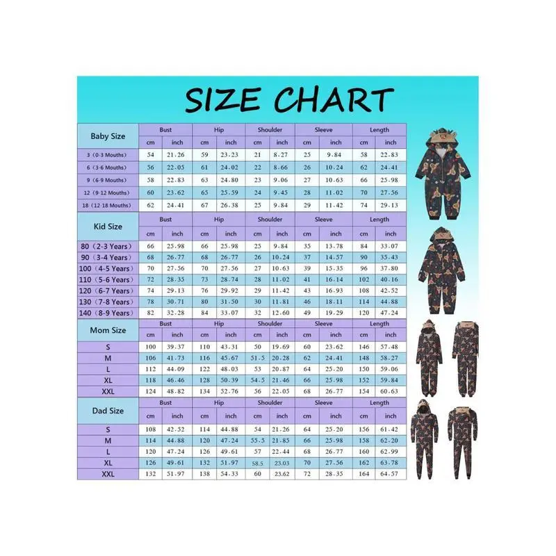Family Matching Christmas Jumpsuits Pajamas Letter/Santa/Tree/Print Hooded Long Sleeve Playsuits Autumn Winter Zipper Long Rompers S Bust: 100/39.37 Hip: 110/43.31 M Bust: 106/41.73 Hip: 116/45.67 L Bust: 112/44.09 Hip: 122/48.03 XL Bust: 118/46.46 Hip: 128/50.39 2XL Bust: 124/48.82 Hip: 134/52.76 S Bust: 108/42.52 Hip: 114/44.88 M Bust: 114/44.88 Hip: 120/47.24 L Bust: 120/47.24 Hip: 126/49.61 XL Bust: 126/49.61 Hip: 132/51.97 2XL Bust: 132/51.97 Hip: 138/54.33 80 Hip: 66/25.98 Bust: 66/25.98 Advised Age: 2-3 Years 90 Hip: 68/26.77 Bust: 68/26.77 Advised Age: 3-4 Years 100 Hip: 70/27.56 Bust: 70/27.56 Advised Age: 4-5 Years 110 Hip: 73/28.74 Bust: 72/28.35 Advised Age: 5-6 Years 120 Hip: 76/29.92 Bust: 74/29.13 Advised Age: 6-7 Years 130 Hip: 80/31.50 Bust: 78/30.71 Advised Age: 7-8 Years 140 Hip: 84/33.07 Bust: 82/32.28 Advised Age: 8-9 Years Hip: 59/23.23 Bust: 54/21.26 Advised Age: 0-3 Months Hip: 61/24.02 Bust: 56/22.05 Advised Age: 3-6 Months Hip: 63/24.80 Bust: 58/22.83 Advised Age: 6-9 Months Hip: 65/25.59 Bust: 60/23.62 Advised Age: 9-12 Months Hip: 67/26.38 Bust: 62/24.41 Advised Age: 12-18 Months Name: Family Matching Christmas Jumpsuits Pajamas Sleeve length: Long Sleeve Pattern: Letter, Santa, Christmas Tree, Elk 1 x Jumpsuits Pajamas 1. Please kindly allow a 2-3% difference according to manual measurement. 2. Please check the measurement chart carefully before you buy the item. (1 inch = 2.54 cm) 3. Please note that a slight color difference should be acceptable due to the light and screen. Thanks. If the product has any quality problems, please feel free to contact us, we will help you solve the problem as quickly as possible.