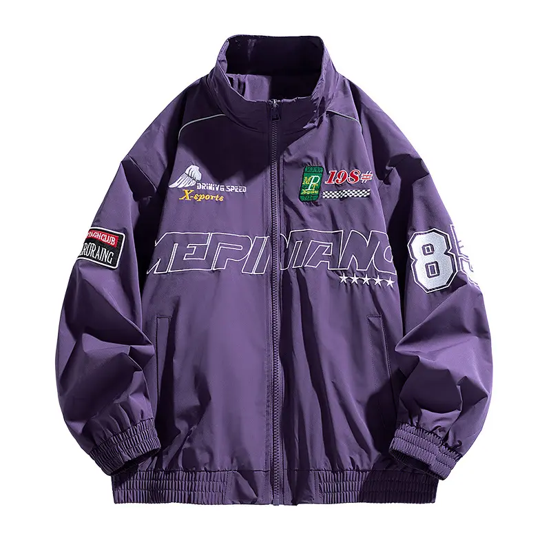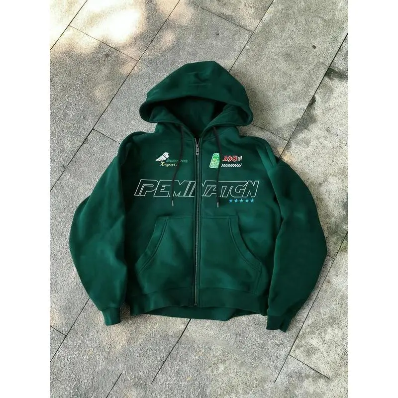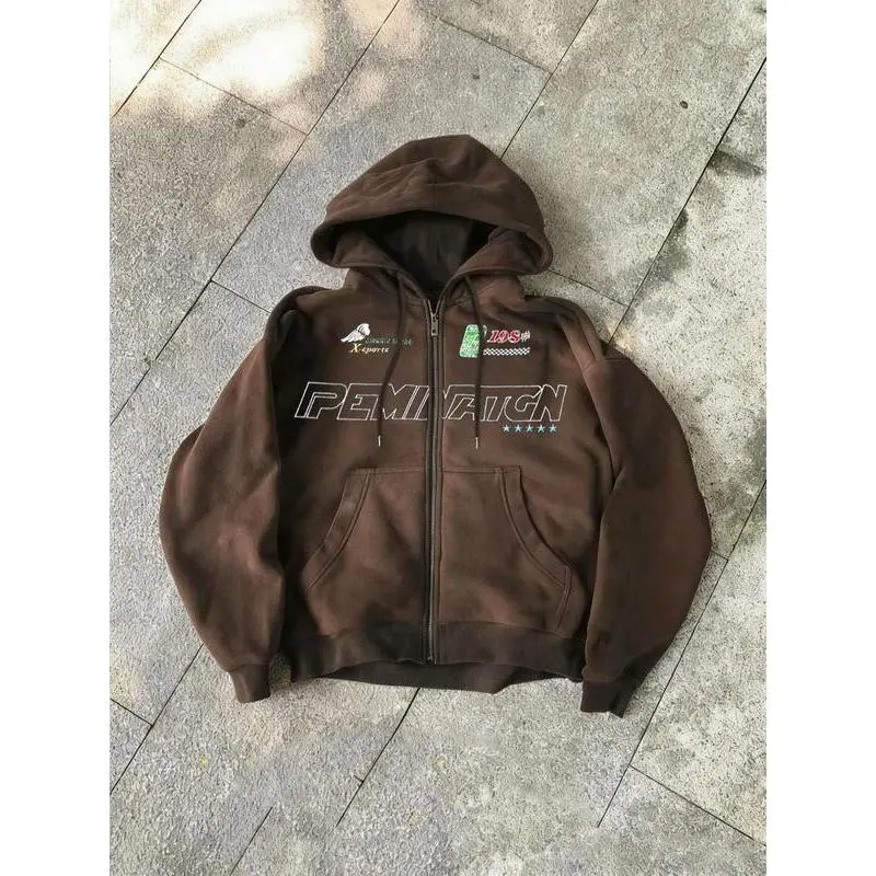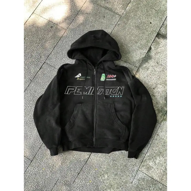 American Retro Style Pemination Hooded Zipper Sweatshirt, Racing Patchwork, Letter Print, Star Embellishment, Streetwear, Loose Fit, Casual Fashion Sweatshirt