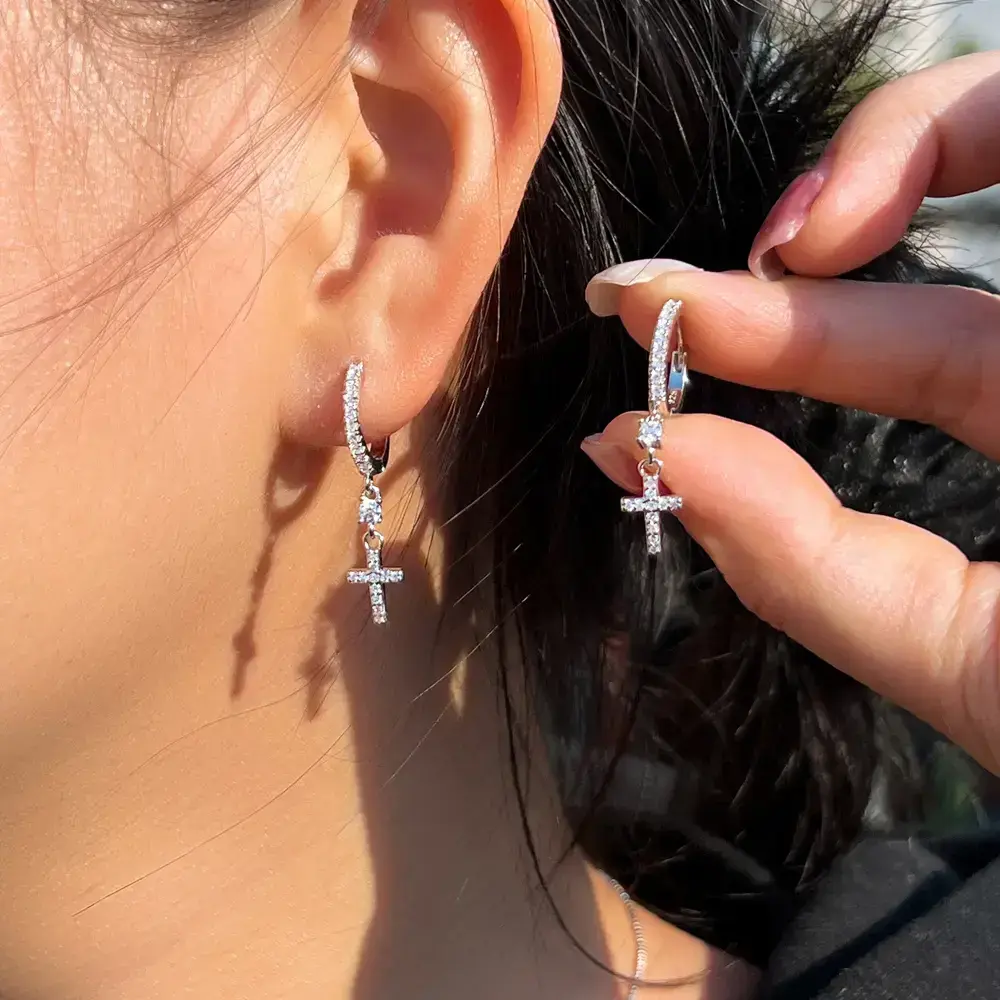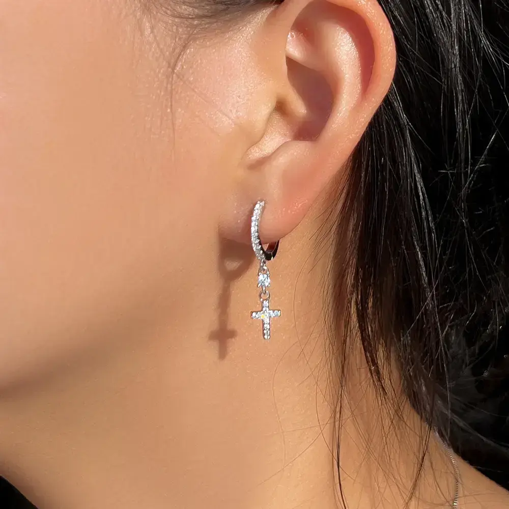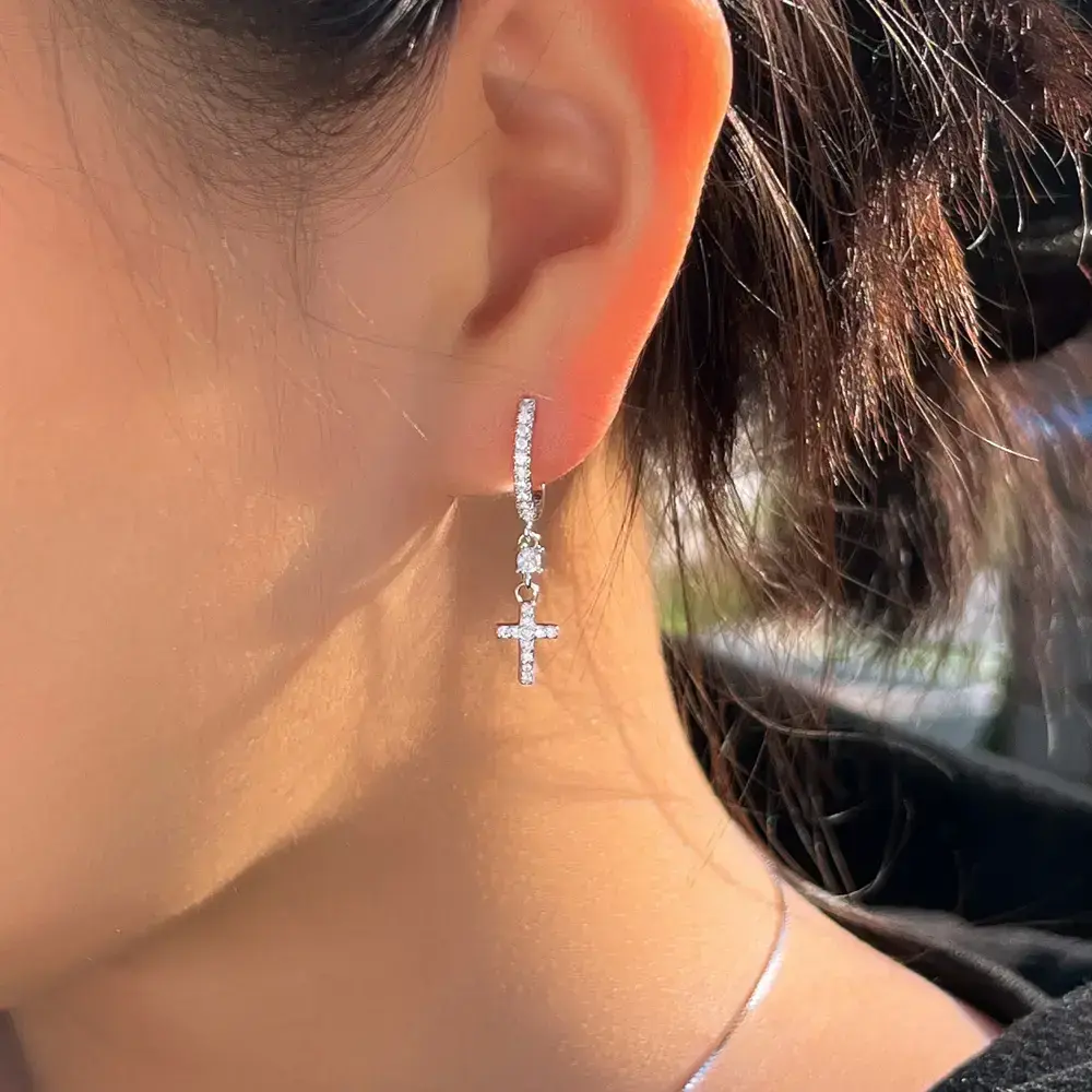 S925 Sterling Silver Cross Dangle Hoop Earrings, Silver Color, Non - Allergic, Elegant Style for Women, Suitable for Daily Wear & Party