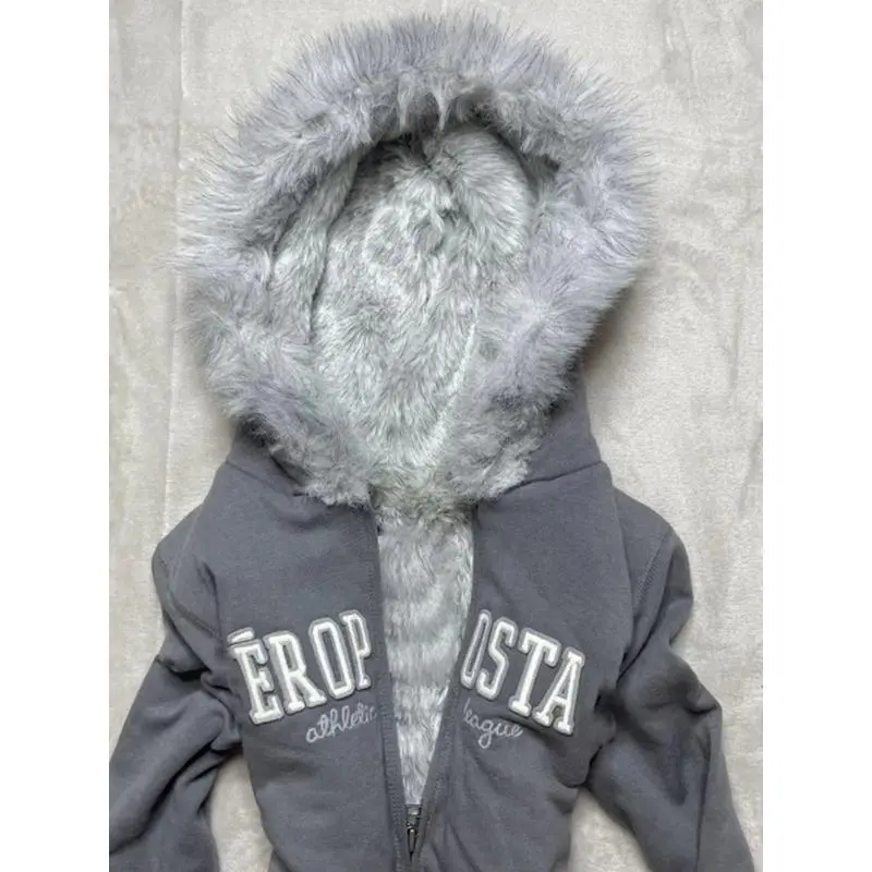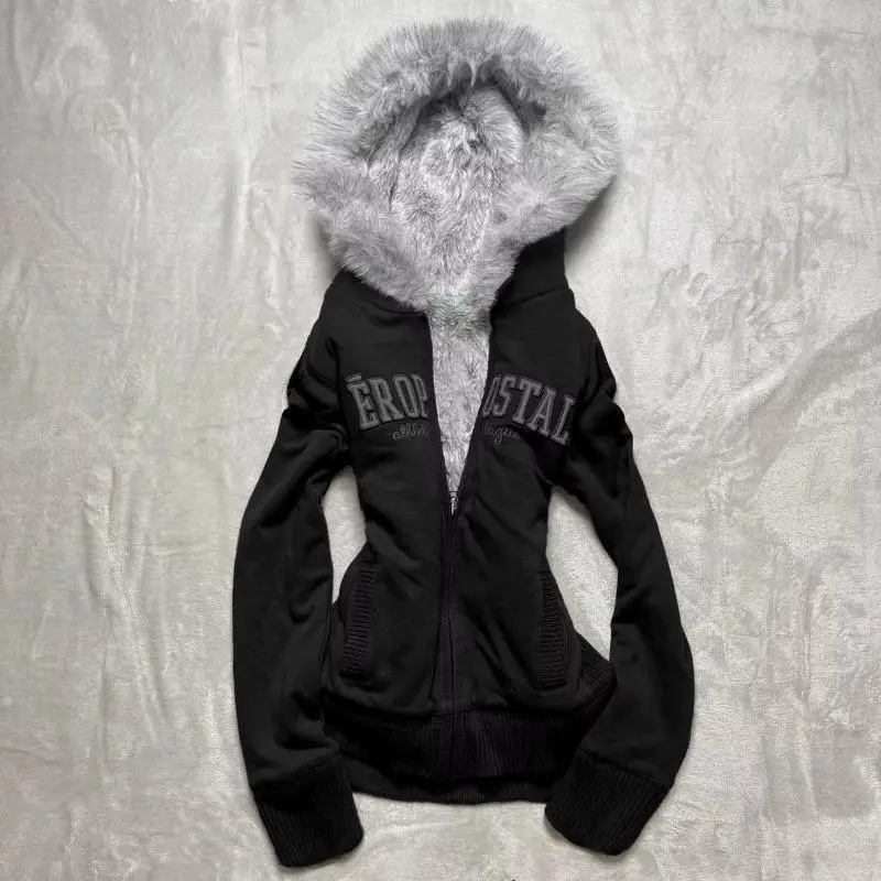 Americanoriginalgrayvelvetthickenedhoodedsweatshirtjacketforwomenretroslimhottiedesignwarmzipperjacket